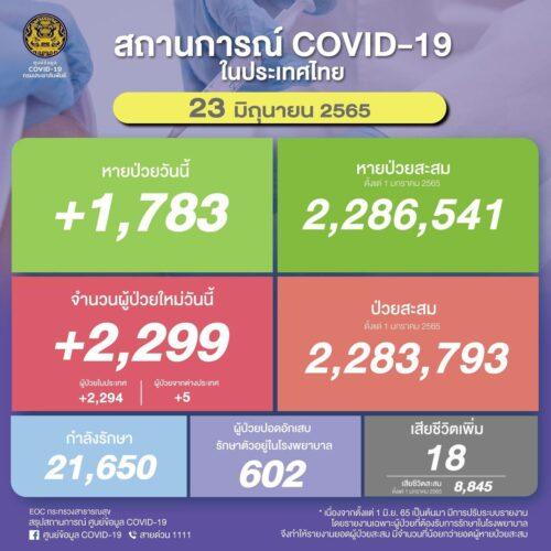 ศูนย์บริหารสถานการณ์โควิด 19 (ศบค.) เปิดเผย ยอดผู้ติดเชื้อโควิด-19 รายใหม่ ณ วันที่ 23 มิถุนายน 2565 รวม 2,299 ราย จำแนกเป็นผู้ป่วยในประเทศ 2,294 ราย ผู้ป่วยมาจากต่างประเทศ 5 ราย ด้านผู้ป่วยสะสมอยู่ที่ 2,283,793 ราย (ตั้งแต่ 1 มกราคม 2565)
