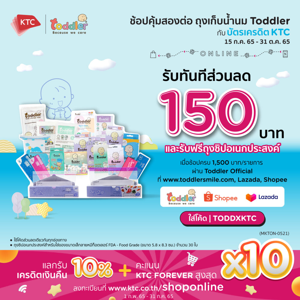 “เคทีซี” หรือ บริษัท บัตรกรุงไทย ร่วมกับ “ท็อตเลอร์” ผลิตภัณฑ์สำหรับคุณแม่ในการดูแลลูกน้อย จัดโปรโมชันมอบส่วนลด 150 บาท พร้อมฟรีถุงซิปอเนกประสงค์สำหรับใส่ของขนาดเล็กลายหมีท็อตเลอร์ FDA – Food Grade (ขนาด 5.8 x 8.3 ซม.) จำนวน 30 ใบ เมื่อช้อป ออนไลน์ครบ 1,500 บาทขึ้นไปต่อยอดซื้อ ผ่านเว็บไซต์ www.toddlersmile.com หรือร้านค้าอย่างเป็นทางการผ่าน https://www.lazada.co.th/shop/toddler หรือ https://shopee.co.th/toddlerfamily โดยระบุรหัสส่วนลด TODDXKTC ระหว่างวันที่ 15 กรกฎาคม 2565 – 31 ตุลาคม 2565 รายละเอียดเพิ่มเติมคลิก https://ktc.today/Toddler-Shoponline
