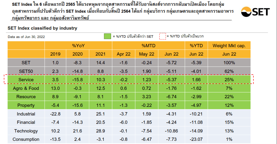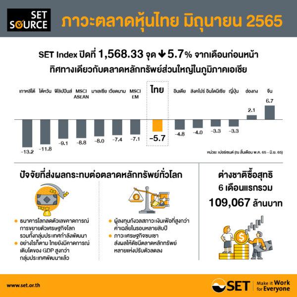 ภาวะตลาดหลักทรัพย์ไทย ณ สิ้นเดือนมิ.ย.2565 SET Index ปิดที่ 1,568.33 จุด ปรับลดลง 5.7% จากเดือนก่อนหน้า และเมื่อเทียบกับสิ้นปี 2564 SET Index ปรับลดลงเพียง 5.4% ซึ่งลดลงน้อยกว่าค่าเฉลี่ยของดัชนีตลาดหลักทรัพย์อื่นในภูมิภาค SET Index ใน 6 เดือนแรกปี 2565 ได้แรงหนุนจากอุตสาหกรรมที่ได้รับอานิสงส์จากการกลับมาเปิดเมือง โดยกลุ่มอุตสาหกรรมที่ปรับตัวดีกว่า SET Index เมื่อเทียบกับสิ้นปี 2564 ได้แก่ กลุ่มบริการ กลุ่มเกษตรและอุสาหกรรมอาหาร กลุ่มทรัพยากร และกลุ่มอสังหาริมทรัพย์