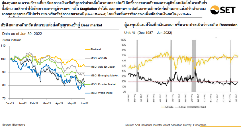 นายศรพล ตุลยะเสถียร รองผู้จัดการ หัวหน้าสายงานวางแผนกลยุทธ์องค์กร ตลาดหลักทรัพย์แห่งประเทศไทย เปิดเผยว่า ผู้ลงทุนแสดงความกังวลเกี่ยวกับสภาวะเงินเฟ้อที่สูงกว่าค่าเฉลี่ยในรอบหลายสิบปี อีกทั้งการขยายตัวของเศรษฐกิจโลกเติบโตในระดับต่ำ ซึ่งมีความเสี่ยงทำให้เกิดภาวะเศรษฐกิจซบเซา หรือ Stagflation ทำให้ผลตอบแทนของดัชนีตลาดหลักทรัพย์หลักหลายแห่งปรับตัวลดลงจากจุดสูงสุดของปีไปกว่า 20% หรือเข้าสู่ภาวะตลาดหมี (Bear Market) โดยเริ่มเห็นการพิจารณาเพิ่มสัดส่วนเงินสดใน portfolio ทำให้ ณ สิ้นเดือนมิ.ย.2565 SET Index ปิดที่ 1,568.33 จุด ปรับลดลง 5.7% จากเดือนก่อนหน้า และเมื่อเทียบกับสิ้นปี 2564 SET Index ปรับลดลงเพียง 5.4% ซึ่งลดลงน้อยกว่าค่าเฉลี่ยของดัชนีตลาดหลักทรัพย์อื่นในภูมิภาค