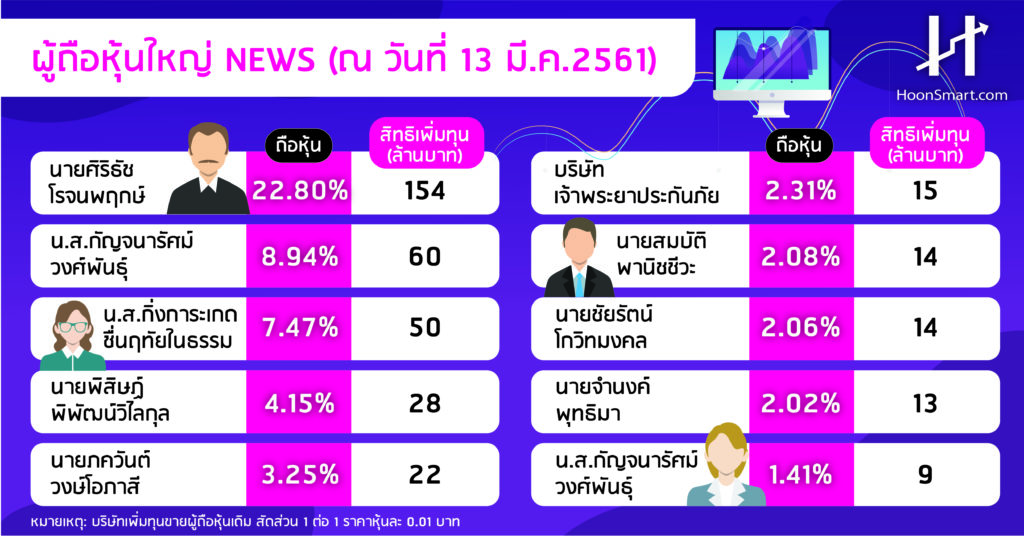 ทั้งนี้ NEWS มีมติคณะกรรมการให้เพิ่มทุนอีก 67,887.51 ล้านบาท จาก เดิม 132,430 ล้านบาท เป็นทุนใหม่ 200,317 ล้านบาท โดยออกหุ้นใหม่ จำนวน 67,887.51 ล้านหุ้น มูลค่าที่ตราไว้หุ้นละ 1 บาท เสนอขายผู้ถือหุ้นเดิม สัดส่วน 1 หุ้นเดิม ต่อ 1 หุ้น ใหม่ ราคาหุ้นละ 0.01 บาท รวม678 ล้านบาท