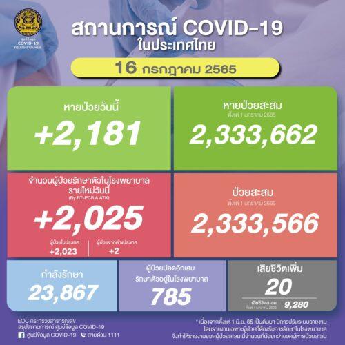 ศูนย์บริหารสถานการณ์โควิด 19 (ศบค.) เปิดเผย ยอดผู้ติดเชื้อโควิด-19 รายใหม่ ณ วันที่ 16 กรกฎาคม 2565 ผู้ป่วยรายใหม่ (รักษาตัวใน รพ.) จำนวน 2,025ราย จำแนกเป็นผู้ป่วยในประเทศ 2,023 ราย ผู้ป่วยมาจากต่างประเทศ 2 ราย ด้านผู้ป่วยสะสมอยู่ที่ 2,333,566 ราย (ตั้งแต่ 1 มกราคม 2565)