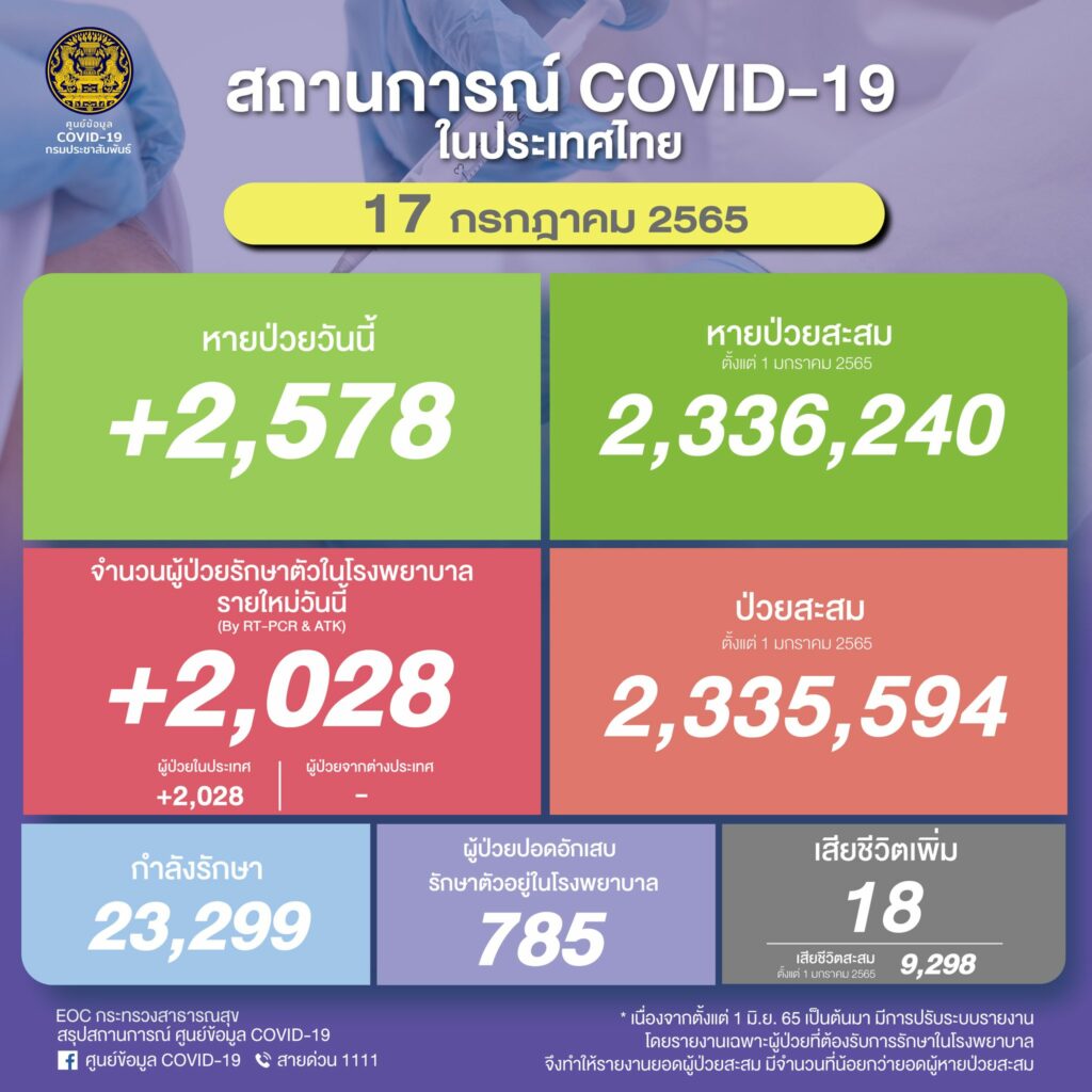 รายงานผู้ป่วยติดเชื้อโควิด-19 วันอาทิตย์ที่ 17 กรกฎาคม 2565
