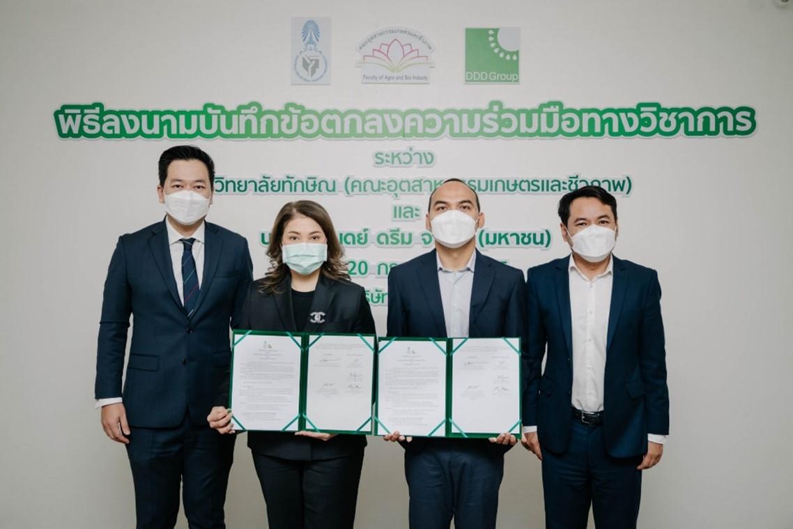 นันทวรรณ สุวรรณเดช (ที่ 2 ซ้าย ) ประธานเจ้าหน้าที่บริหาร , ธิติ รัตนมณี (ที่ 1 ซ้าย) ประธานเจ้าหน้าที่สายงานพัฒนาธุรกิจ บริษัท ดู เดย์ ดรีม ( DDD) , รศ.ดร.สมัคร แก้วสุกแสง (ที่ 2 ขวา ) รักษาการแทนรองอธิการบดีฝ่ายวิจัยและนวัตกรรม และ ผช.ศ. ดร.ถาวร จันทโชติ (ที่ 1 ขวา) คณบดี คณะอุตสาหกรรมเกษตรและชีวภาพและรักษาการแทนรองอธิการบดีฝ่ายยุทธศาสตร์และประกันคุณภาพ มหาวิทยาลัยทักษิณ ลงนามบันทึกข้อตกลงความร่วมมือ (MOU) วิจัยและพัฒนายกระดับวัตถุดิบท้องถิ่น ผลิตภัณฑ์ชุมชน และพัฒนาระบบการศึกษา ให้สอดคล้องกับความต้องการของตลาดแรงงาน