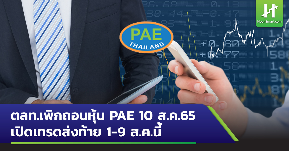ตลาดหลักทรัพย์แห่งประเทศไทย ( SET) แจ้งเตือนผู้ถือหุ้นและนักลงทุน ศึกษาข้อมูลบริษัท พีเออี (ประเทศไทย ) หรือ PAE ก่อนตัดสินใจซื้อขาย เนื่องจากตลาด จะเปิดให้ซื้อขายหุ้น PAE เป็นเวลา 7 วันทำการ ระหว่างวันที่ 1-9 ส.ค.นี้ ก่อนเพิกถอนหลักทรัพย์ ออกจากตลาดหลักทรัพย์