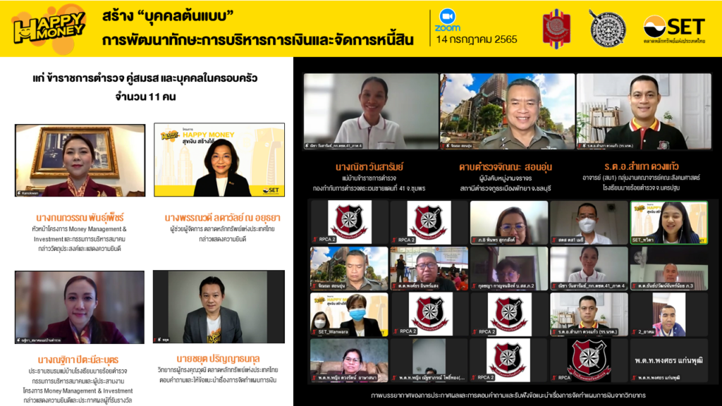 ตลาดหลักทรัพย์แห่งประเทศไทย ร่วมกับสมาคมแม่บ้านตำรวจ จัดกิจกรรมส่งเสริมความรู้ด้านการเงิน การจัดการหนี้ และการออม ภายใต้โครงการ “Money Management & Investment” แก่ข้าราชการตำรวจทุกสังกัดทั่วประเทศ พร้อมด้วยคู่สมรสและบุคคลในครอบครัว รวมทั้ง Workshop จัดทำแผนการเงินของตนเอง โดยสร้างบุคคลต้นแบบการพัฒนาทักษะบริหารการเงินและจัดการหนี้สิน 11 คน