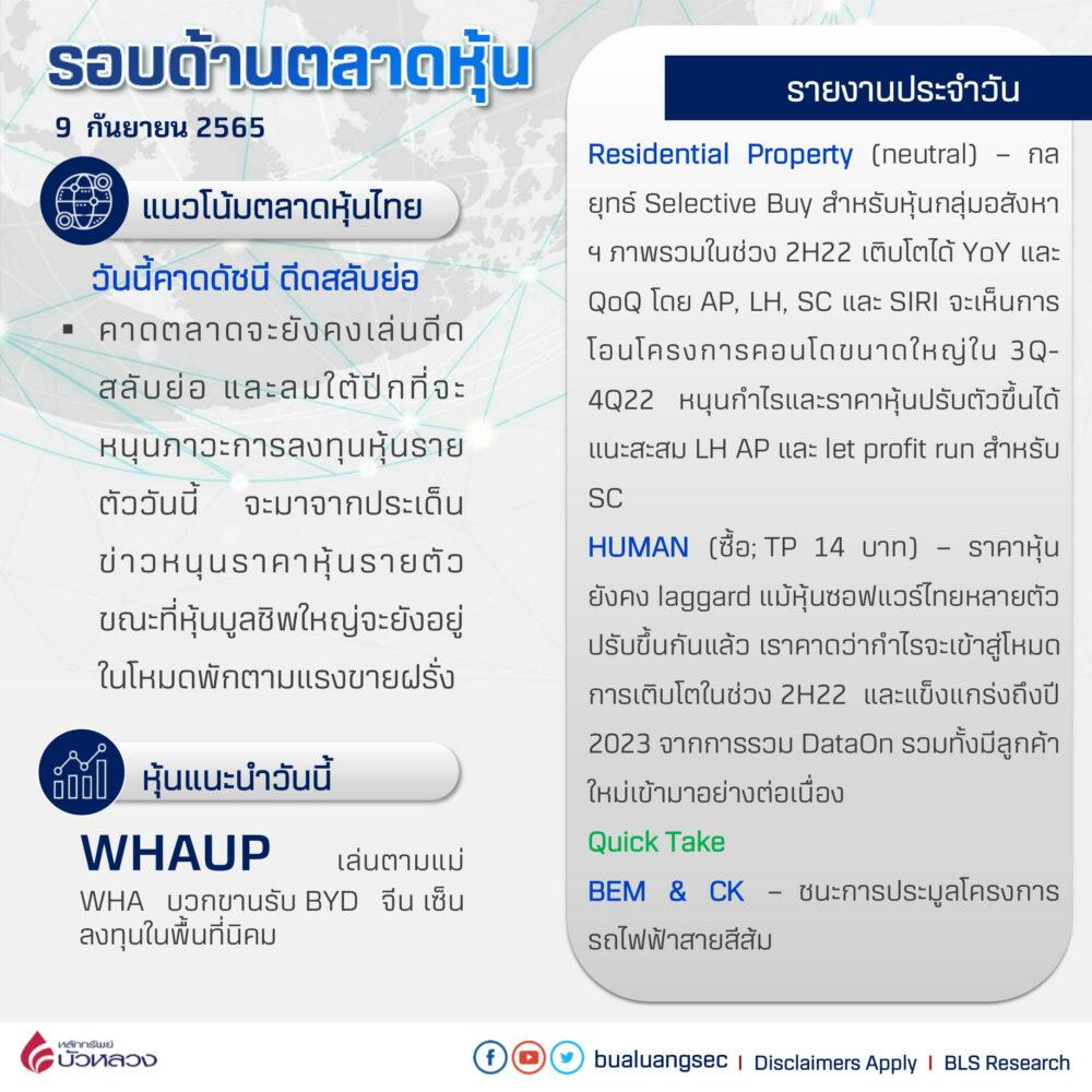 HoonSmart.com>>บล.บัวหลวง คาดแนวโน้มตลาดหุ้นวันนี้ยังคงเล่นดีดสลับย่อ และลมใต้ปีกที่จะหนุนภาวะการลงทุนหุ้นรายตัววันนี้ มาจากประเด็นข่าวหนุนราคาหุ้นรายตัว ขณะที่หุ้นบลูชิพใหญ่จะยังอยู่ในโหมดพักตามแรงขายฝรั่ง หุ้นแนะนำ WHAUP เล่นตามแม่ WHA บวกขานรับ BYD จีน เซ็นลงทุนในพื้นที่นิคม