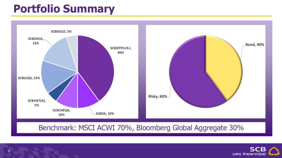 ปัจจุบันพอร์ตลงทุน SCB Grow Together มีน้ำหนักในตราสารหนี้ระยะสั้น 40% และอีก 60% เป็นสินทรัพย์เสี่ยง ได้แก่หุ้นที่มีความผันผวนต่ำ, หุ้นเฮลธ์แคร์,หุ้นจีน หุ้นเวียดนามและทองคำ ซึ่งมองหุ้นจีนและเวียดนามปรับตัวลดลงมามาก ขณะที่ราคา โดยเฉพาะหุ้นเวียดนามไม่แพงเมื่อเทียบอดีต แต่ในภาพการเติบโตเศรษฐกิจ IMF ยังมองเวียดนามโต 6-7% ในภาวะที่ทุกคนกลัวเศรษฐกิจถดถอยและกำไรบริษัทจดทะเบียนยังเติบโตสูง การมองสวนตลาดก็มีโอกาส
