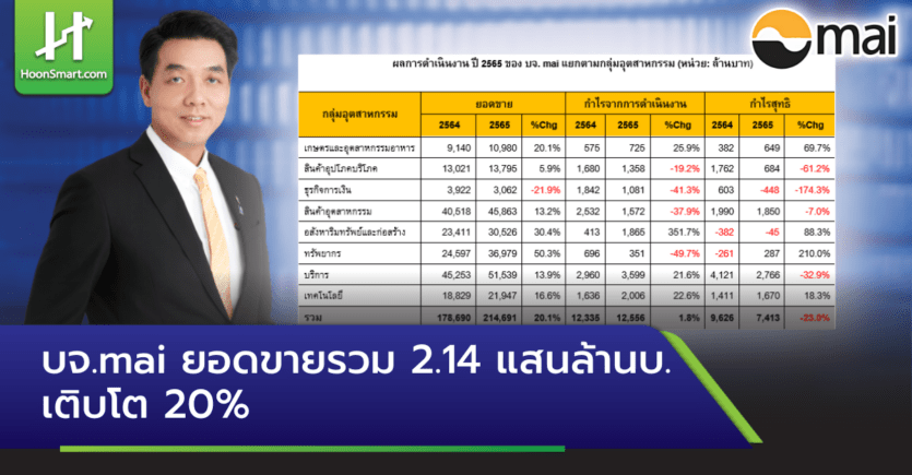HoonSmart.com >> บจ. mai รายงานผลการดำเนินงาน ปี 2565 ยอดขายรวม 214,691 ล้านบาท โต 20.1% กำไรจากการดำเนินงานรวม 12,556 ล้านบาท เพิ่มขึ้นเล็กน้อย 1.8% กลุ่มเกษตรและอุตสาหกรรมอาหาร กลุ่มอสังหาริมทรัพย์และก่อสร้าง และกลุ่มเทคโนโลยี มีผลการดำเนินงานดี