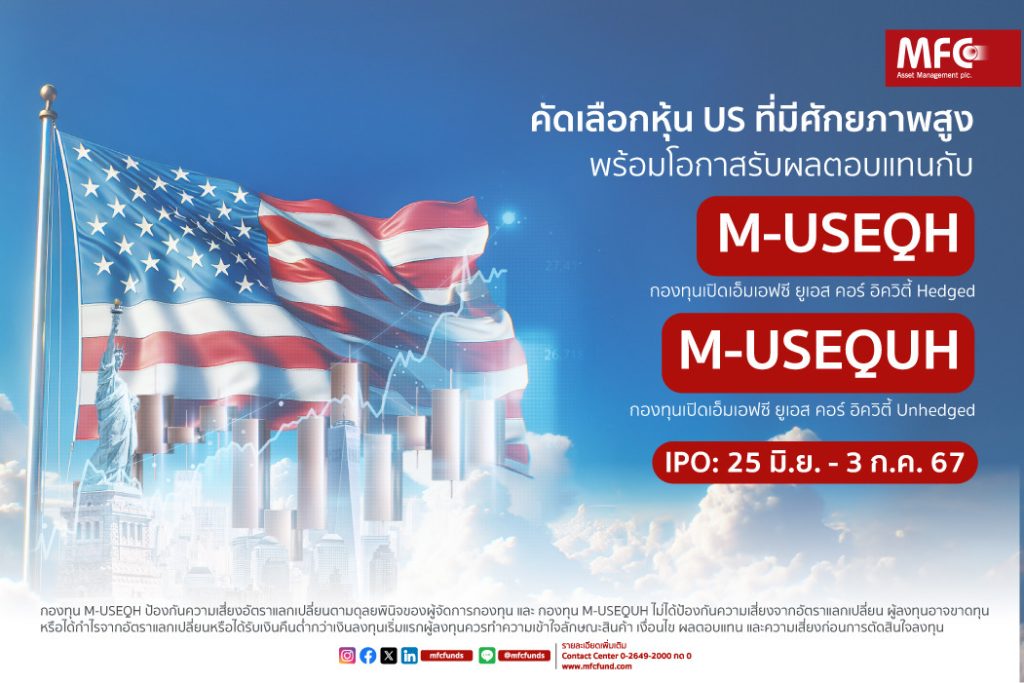 HoonSmart.com>> บลจ.เอ็มเอฟซี เสิร์ฟกองทุนหุ้นสหรัฐฯ “M-USEQH , M-USEQUH ” ชูนโยบายลงทุนแบบยืดหยุ่น บริหารแบบเชิงรุก ปรับเปลี่ยนสไตล์การลงทุนให้สอดคล้องกับแนวโน้มของตลาด ลงทุนผ่านกองทุนหลัก Morgan Stanley Investment Funds US Core Equity Fund เฟ้นหุ้นปัจจัยพื้นฐานแกร่ง เพิ่มทางเลือกลงทุนผ่าน 2 กองทุนทั้งแบบป้องกัน-ไม่ป้องกันความเสี่ยงค่าเงิน เปิดขาย IPO ตั้งแต่ 25 มิ.ย.-3 ก.ค. 67 ลงทุนขั้นต่ำ 1,000 บาท