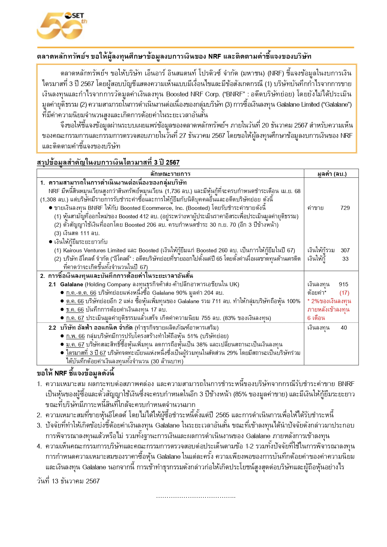 HoonSmart.com>>ตลาดหลักทรัพย์ฯ เตือนผู้ลงทุนศึกษาข้อมูลงบไตรมาส 3/67 “เอ็นอาร์ อินสแตนท์ โปรดิวซ์” (NRF) และติดตามคำชี้แจงบริษท หลังผู้สอบบัญชีแสดงความเห็นแบบมีเงื่อนไข ตั้งข้อสังเกตุ 3 กรณี “บุ๊กกำไรขายเงินลงทุน กำไรจากวัดมูลค่าเงินลงทุน BNRF-ความสามารถในการดำเนินงานกลุ่มบริษัท-ซื้อเงินลงทุน Galalane ค่าความนิยมจำนวนสูงและเกิดการด้อยค่าในระยะสั้น สั่งแจงข้อมูลภายใน 20 ธ.ค.นี้ พร้อมความเห็นบอรด์เดทไลน์ 27 ธ.ค.67