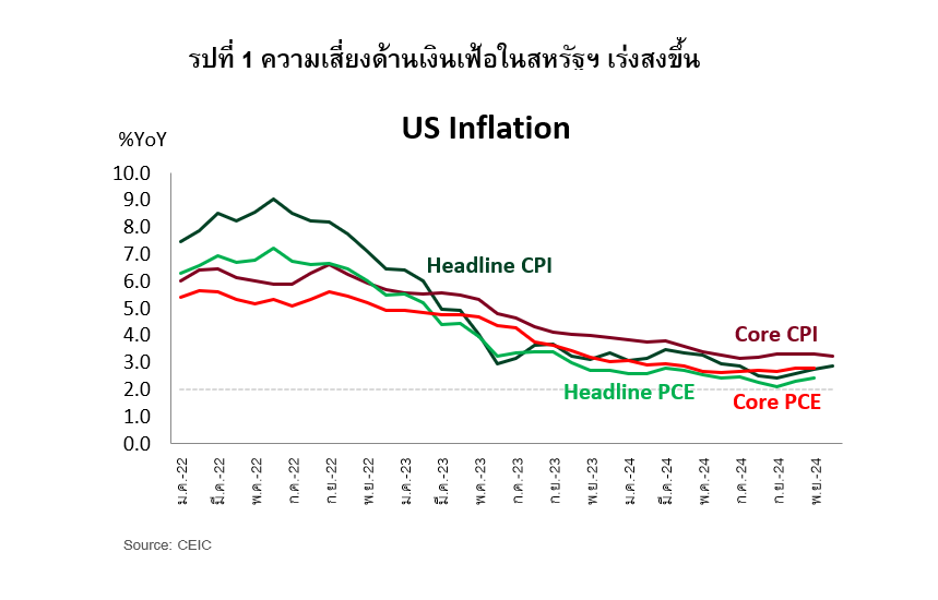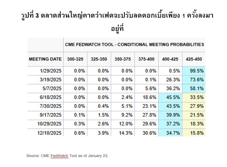 ทั้งนี้ มีความเป็นไปได้ที่เฟดจะคงดอกเบี้ยที่ระดับ 4.25-4.50% ในไตรมาส 1/2568 หากโมเมนตัมเศรษฐกิจและเงินเฟ้อไม่เปลี่ยนแปลงไปจากปัจจุบันเท่าใดนัก ประกอบกับหากสหรัฐฯ มีการปรับขึ้นภาษีนำเข้ากับสินค้าเม็กซิโก แคนาดา และจีน ตามที่ได้ประกาศไว้ซึ่งมีแนวโน้มส่งผลให้แรงกดดันด้านเงินเฟ้อเพิ่มสูงขึ้น