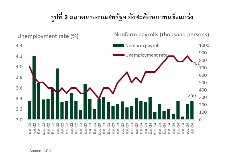 ด้านตัวเลขตลาดแรงงานยังสะท้อนภาพแข็งแกร่ง โดยตัวเลขการจ้างงานนอกภาคเกษตร (Non-farm payrolls) เดือนธ.ค. 2567 ปรับสูงขึ้นมากกว่าตลาดคาดที่ 256,000 ตำแหน่ง ขณะที่อัตราการว่างงานเดือนธ.ค. 2567 ปรับลดลงมาอยู่ที่ 4.1%