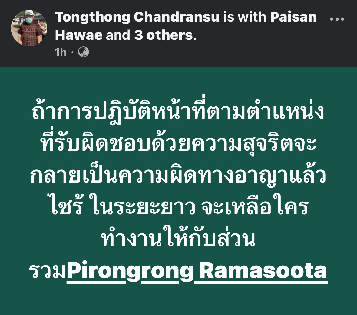 ศาสตราจารย์พิเศษธงทอง จันทรรางศุ โพสต์ผ่านเฟสบุ๊คกล่าวถึงกรณีนี้ว่า “ถ้าการปฏิบัติหน้าที่ตามตำแหน่งที่รับผิดชอบด้วยความสุจริตจะกลายเป็นความผิดทางอาญาแล้วไซร้ ในระยะยาว จะเหลือใครทำงานให้กับส่วนรวม”