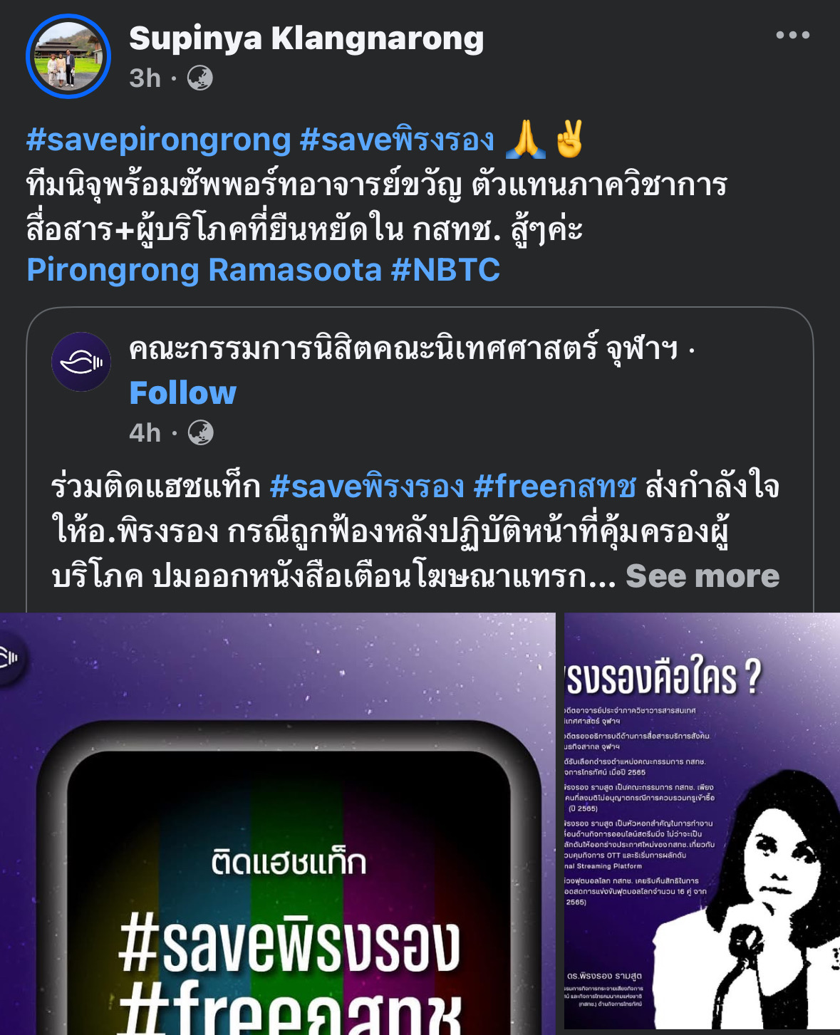 ทางด้านนางสาวสุภิญญา กลางณรงค์ อดีต กรรมการ กสทช.และโพสต์ผ่านเฟสบุ๊คส่วนตัว ส่งกำลังใจให้ “พิรงรอง” ที่ยืนหยัดต่อสู้ เพื่อ กสทช.