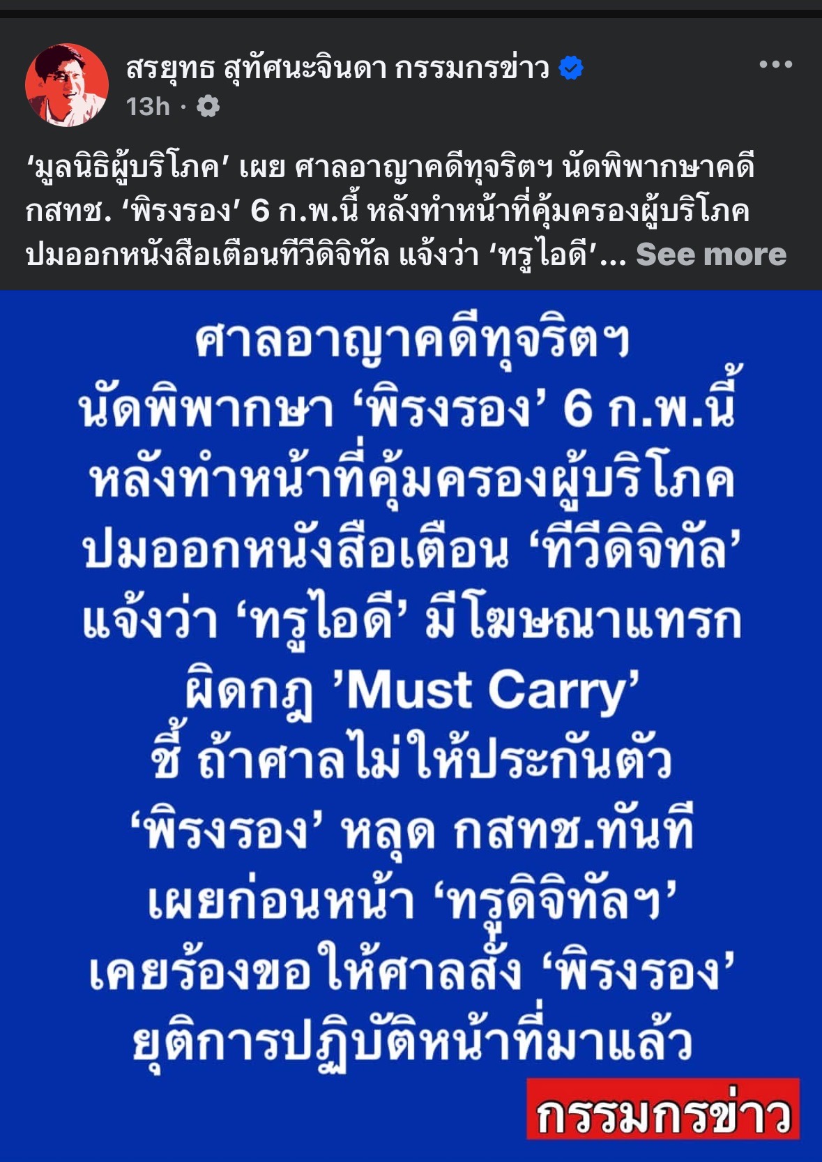 นายสรยุทธ สุทัศนะจินดา นำเสนอข่าวผ่านเฟสบุ๊คแฟนเพจ กรรมกรข่าว ชวนจับตาดูการพิจารณาคดีดังกล่าว หลัง “พิรงรอง” ทำหน้าที่คุ้มครองผู้บริโภค