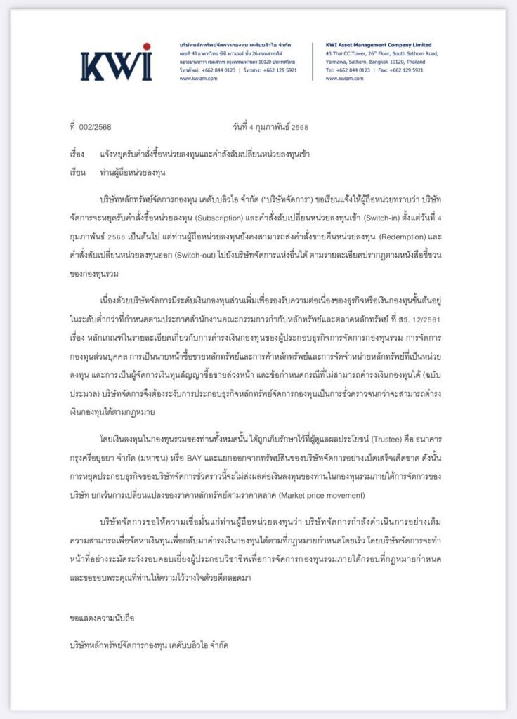 บริษัทหลักทรัพย์จัดการกองทุน (บลจ.) เคดับบลิวไอ จำกัด ประกาศแจ้งผู้ถือหน่วยว่า บริษัทจัดการจะหยุดรับคำสั่งซื้อหน่วยลงทุน (Subscription) และคำสั่งสับเปลี่ยนหน่วยลงทุนเข้า (Switch-in) ตั้งแต่วันที่ 4 ก.พ.2568 เป็นต้นไป แต่ยังคงสามารถส่งคำสั่งขายคืนหน่วยลงทุน (Redemption) และคำสั่งสับเปลี่ยนหน่วยลงทุนออก (Switch-out) ไปยังบริษัทจัดการแห่งอื่นได้ ตามรายละเอียดปรากฏตามหนังสือชี้ชวนของกองทุนรวม