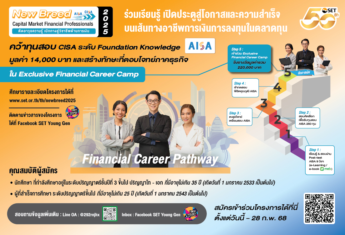 ตลาดหลักทรัพย์แห่งประเทศไทยชวนนิสิตนักศึกษาและวัยเริ่มต้นทำงาน (First Jobber) ร่วมค้นหาศักยภาพด้านการเงินการลงทุนของตนเองไปกับโครงการ “New Breed Capital Market Financial Professionals 2025” ติดอาวุธความรู้ เพิ่มทักษะในสายอาชีพการเงินและการลงทุน และเพิ่มประสบการณ์ในโลกธุรกิจจริง