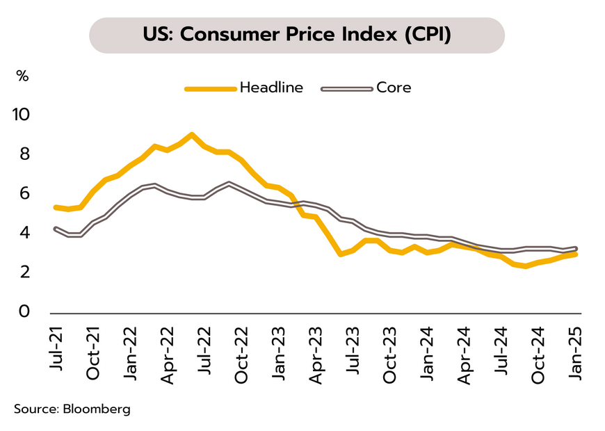แม้ว่าอัตราเงินเฟ้อที่เร่งตัวขึ้นจะลดทอนโอกาสปรับลดอัตราดอกเบี้ยในการประชุมเดือนมีนาคม แต่เศรษฐกิจยังเผชิญแรงกดดันจากยอดรีไฟแนนซ์หนี้และอัตราการผิดนัดชำระหนี้ของภาคเอกชนที่เพิ่มขึ้น ล่าสุด นายโดนัลด์ ทรัมป์ ลงนามให้มีการศึกษาแผนการจัดเก็บภาษีศุลกากรตอบโต้ (Reciprocal Tariffs) กับประเทศต่างๆ โดยพิจารณาจากด้านที่มิใช่ภาษีศุลกากร (Non-Tariffs) ด้วย ซึ่งอาจเพิ่มความตึงเครียดทางการค้าและเพิ่มความเสี่ยงต่อเศรษฐกิจสหรัฐฯ เบื้องต้นคาดว่าผลการศึกษาจะเสร็จภายในวันที่ 1 เมษายนนี้ นอกจากนี้ นโยบายปราบปรามผู้อพยพผิดกฎหมายยังเพิ่มความเสี่ยงต่อตลาดแรงงานและการเติบโตทางเศรษฐกิจ ด้วยเหตุนี้ วิจัยกรุงศรีจึงประเมินว่าเฟดอาจปรับลดดอกเบี้ยลงได้อีก 0.50-0.75% ในปีนี้ เพื่อป้องกันการชะลอตัวของเศรษฐกิจในระยะข้างหน้า