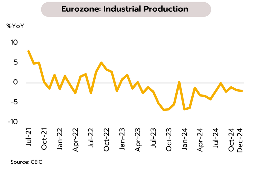 ขณะที่เศรษฐกิจยูโรโซนเปราะบาง ท่ามกลางความเสี่ยงทางการเมืองและสงครามการค้า คาดหนุน ECB เดินหน้าลดดอกเบี้ย เศรษฐกิจยูโรโซนโต 0% QoQ ในไตรมาส 4 ปี 2567 ชะลอลงจากไตรมาสก่อนหน้าที่ 0.4% ขณะที่ผลผลิตภาคอุตสาหกรรมหดตัวแรงขึ้นจาก -1.8% ในเดือนพฤศจิกายน สู่ระดับ -2.0% YoY ในเดือนธันวาคม