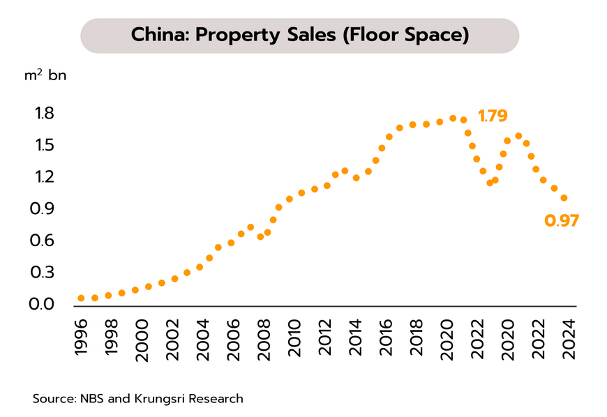 สถานการณ์ของภาคอสังหาฯมีแนวโน้มดีขึ้นบ้างในระยะที่ผ่านมา แต่ปัญหาหนี้สินและสภาพคล่องทางการเงินยังคงเป็นแรงกดดันสำคัญ โดยผู้พัฒนาอสังหาฯ หลายรายเผชิญกับการฟ้องร้องให้มีการชำระบัญชี ขณะที่ยอดขายอสังหาฯ รวมในปี 2567 ยังคงต่ำกว่าจุดสูงสุดในปี 2564 ถึง 45.7% (ดังรูป) ทั้งนี้ เศรษฐกิจจีนในภาพรวมยังคงเผชิญแรงกดดันจากปัญหาอุปทานส่วนเกินในภาคการผลิตและภาคอสังหาฯ รวมทั้งปัญหาเชิงโครงสร้าง ในระยะต่อไปจีนจึงจำเป็นต้องพึ่งพาแรงหนุนจากมาตรการกระตุ้นเพื่อพยุงการเติบโตทางเศรษฐกิจท่ามกลางความตึงเครียดทางการค้าที่ทวีความรุนแรงขึ้น