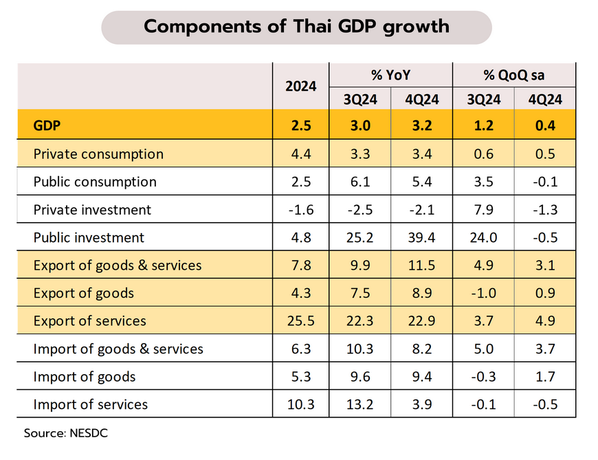 วิจัยกรุงศรี โดยธนาคารกรุงศรีอยุธยา (BAY) เปิดเผยว่า การขยายตัวทางเศรษฐกิจ (GDP) ไตรมาส 4 ปี 2567 ของไทยแม้เติบโตได้ 3.2% YoY แต่เมื่อเทียบกับไตรมาสก่อนเพิ่มขึ้นเพียงเล็กน้อยแม้จะมีมาตรการกระตุ้นเศรษฐกิจ สภาพัฒน์ฯ รายงานเศรษฐกิจไทยในไตรมาสสุดท้ายของปีก่อนขยายตัว 3.2% ต่ำกว่าที่นักวิเคราะห์คาดการณ์ไว้ที่ 3.9% และเมื่อหักผลของฤดูกาลออกแล้ว GDP เติบโตเพียง 0.4% QoQ เทียบกับ 1.2% ในไตรมาสก่อนหน้า สำหรับทั้งปี 2567 เศรษฐกิจไทยยังเติบโตต่ำที่ 2.5% จาก 2.0% ในปี 2566 ส่วนในปี 2568 สภาพัฒน์ฯ ยังคงคาดการณ์อัตราการขยายตัวของเศรษฐกิจไว้ที่ 2.3-3.3% (ค่ากลางที่ 2.8%)