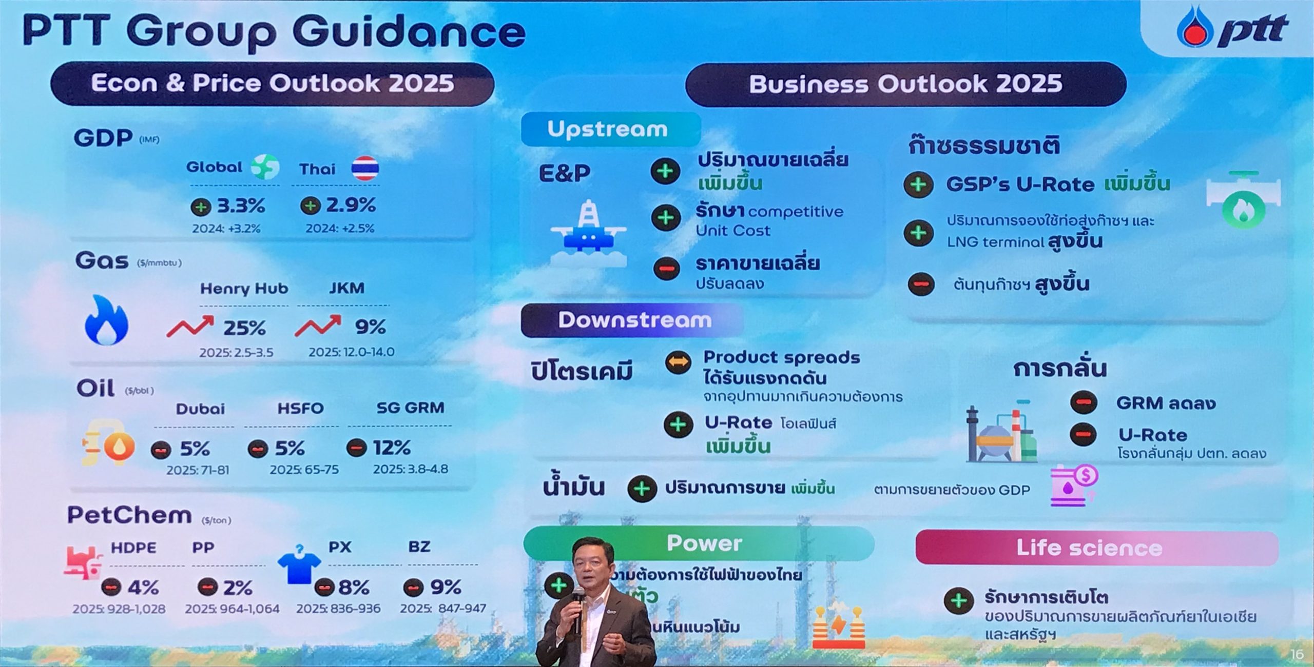 สำหรับภาพรวมธุรกิจปี 2568 คาดเศรษฐกิจเติบโต 2.9% เติบโตมากกว่าปีก่อนที่ขยายตัว 2.5% ราคาน้ำมันดิบดูไบลดลง 5% ราคาเคลื่อนไหวในช่วง 71-81 ดอลลาร์/บาร์เรล ธุรกิจของปตท.สผ.ไปได้ดี เพิ่มแหล่งสำรวจ ปริมาณขายเฉลี่ยน่าจะเพิ่มขึ้น ราคาขายเฉลี่ยคาดว่าจะปรับลดลง และ LNG terminal สูงขึ้นและปริมาณขาย ส่วนธุรกิจปิโตรเคมี ยังทรงตัว ๆ ได้รับแรงกดดันมาร์จิ้นแคบ จากอุปทานที่มากเกินความต้องการ ธุรกิจโรงกลั่นกำลังการผลิตลดลงในปีนี้ ปริมาณขายน้ำมันเพิ่มขึ้น บริษัทไทยออยล์ (TOP) จะปิดซ่อมบำรุงตามกำหนด ส่วน GPSC เพิ่มพลังงานสะอาดป้อนบริษัทในกลุ่มปตท.