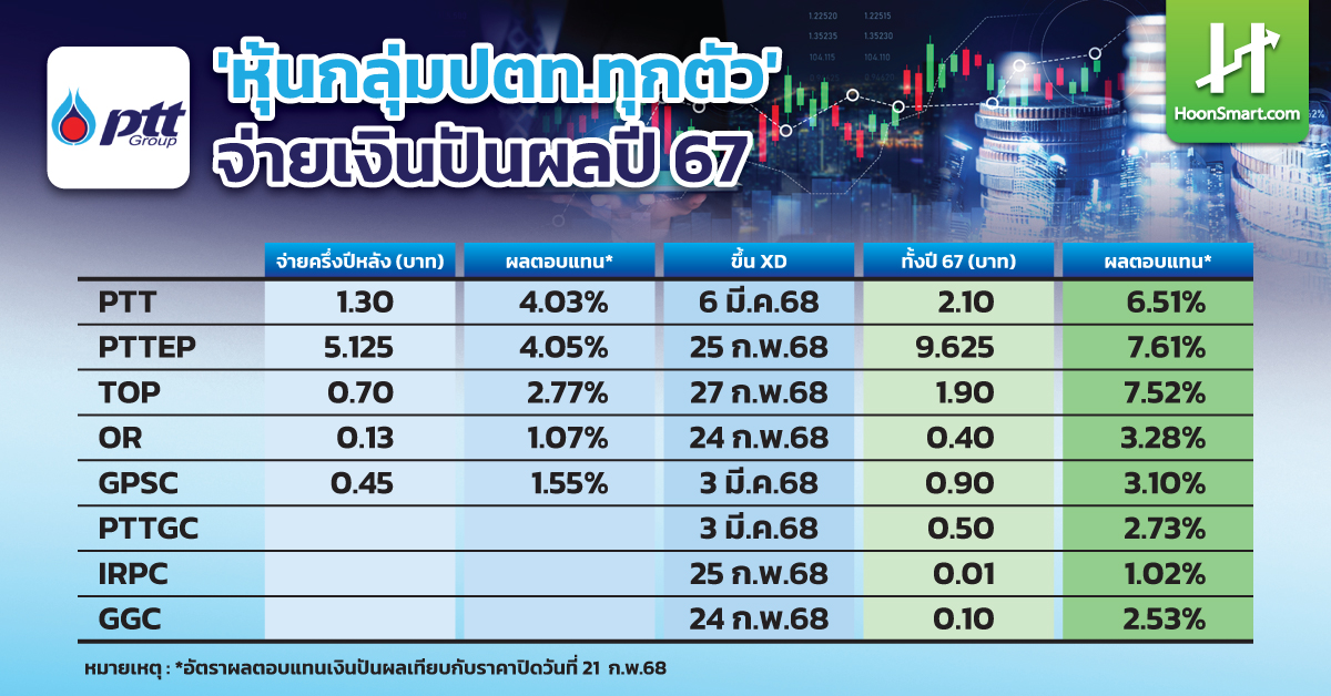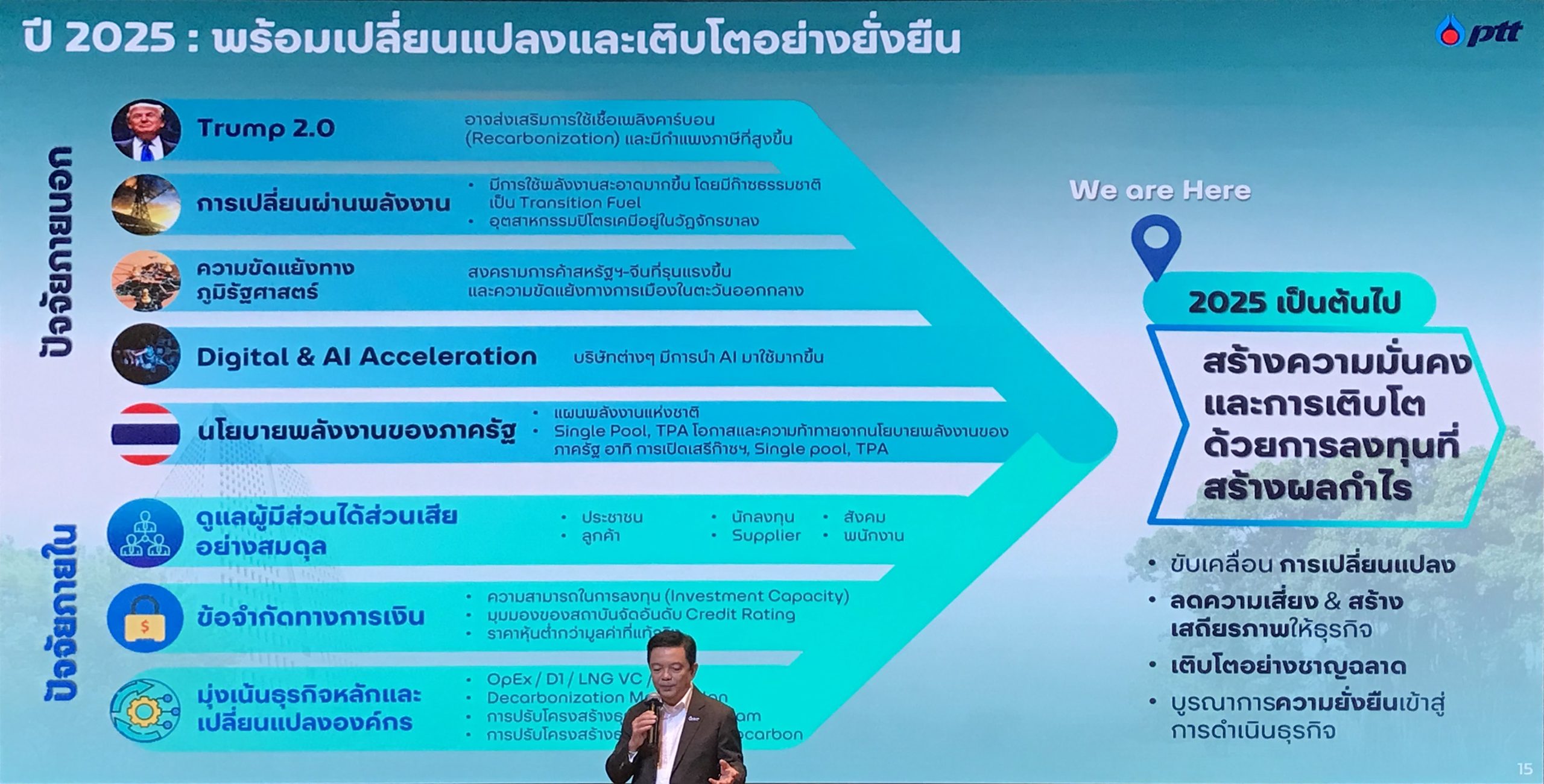 นายคงกระพัน อินทรแจ้ง ประธานเจ้าหน้าที่บริหารและกรรมการผู้จัดการใหญ่ บริษัท ปตท. (PTT) แถลงผลการดำเนินงานและกลยุทธ์การเติบโตอย่างยั่งยืนว่า ผลประกอบการในปี 2568 จะต้องดีกว่าปีที่ผ่านมา ซึ่งมีรายได้จำนวน 3.09 ล้านล้านบาท กำไรสุทธิ 90,072 ล้านบาท มาจากธุรกิจ Upstream ของปตท.สผ.เป็นหลัก มีการปรับโครงสร้าง ปรับกลยุทธ์ต่าง ๆ โดยมุ่งเน้นธุรกิจที่เกี่ยวกับความมั่นคงด้านพลังงาน ควบคู่ไปกับการลดก๊าซเรือนกระจก เพิ่มเงินปันผลหุ้นละ 2.10 บาท อัตราผลตอบแทนประมาณ 6.6% ต่อปี แบ่งจ่ายเงินครึ่งปีหลัง 1.30 บาท ผลตอบแทนประมาณ 4.03% ทั้งนี้การจ่ายเงินปันผลต้องเหมาะสมจะพิจารณาถึงผลตอบแทนด้วยไม่ใช่ดูสัดส่วนการจ่ายจากกำไรเพียงอย่างเดียว และที่ผ่านมาจ่ายสูงกว่านโยบายที่กำหนดไม่ต่ำกว่า 25% มาตลอด