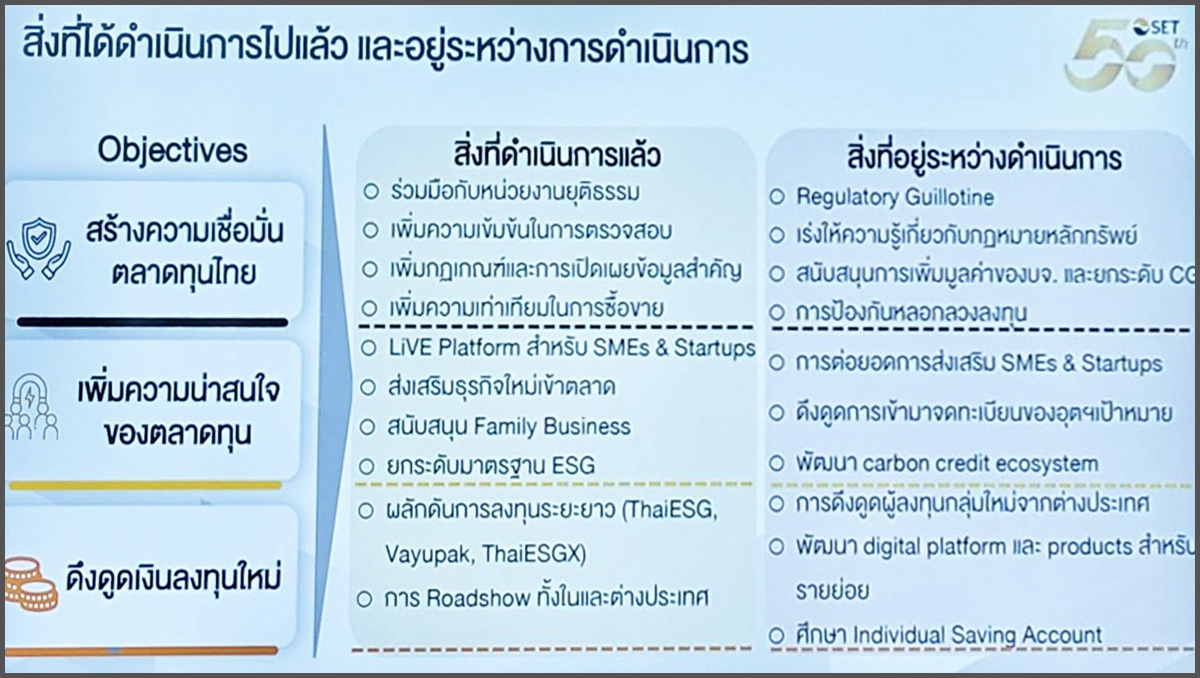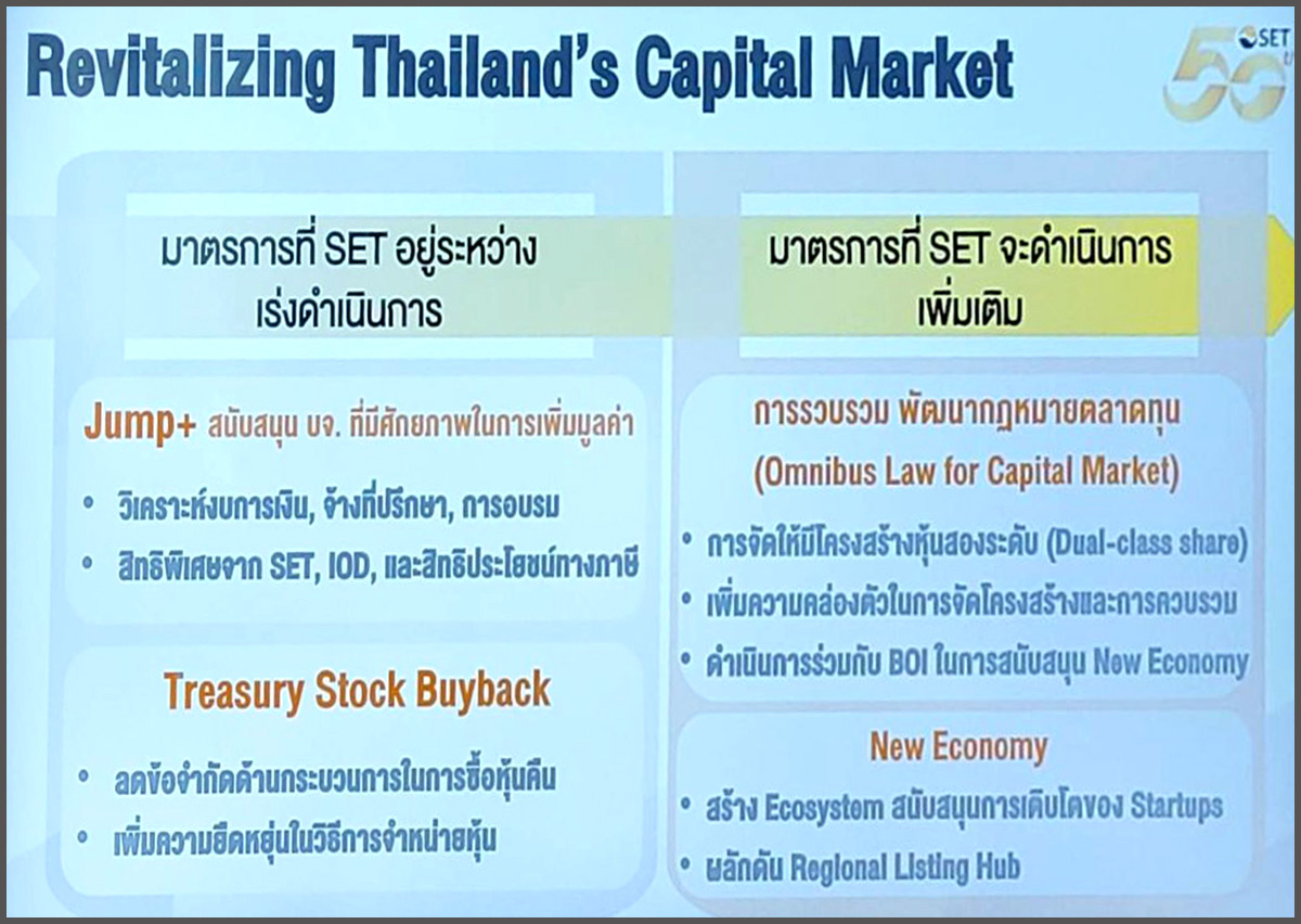 สำหรับ การแก้ไขกฎหมายที่เกี่ยวข้องกับตลาดทุนแบบองค์รวม หรือ Omnibus Law เป็นมาตรการที่ SET จะดำเนินการเพิ่มเติม เพื่อที่จะสามารถจัดโครงสร้างหุ้นสองระดับ (Dual-Class share)ให้เกิดขึ้นในตลาดหุ้นไทย เหมือนที่ตลาดหุ้นในประเทศที่เจริญแล้ว รวมถึงตลาดในแถบอาเซียนบางประเทศมีหุ้นสองระดับแล้ว ,เพิ่มความคล่องตัวในการจัดโครงสร้างและการควบรวมกิจการ และจะร่วมกับสำนักงานคณะกรรมการส่งเสริมการลงทุน (BOI) เพื่อสร้างธุรกิจแห่งอนาคต หรือ New Economy ที่จำเป็นต้องสร้างระบบนิเวศน์ หรือ Ecosystem ที่เหมาะสมในการสนับสนุนการเติบโตของธุรกิจสตาร์ทอัพ และเอสเอ็มอี และผลักดันให้ตลาดทุนไทยเป็นศูนย์กลางในภูมิภาคอาเซียน