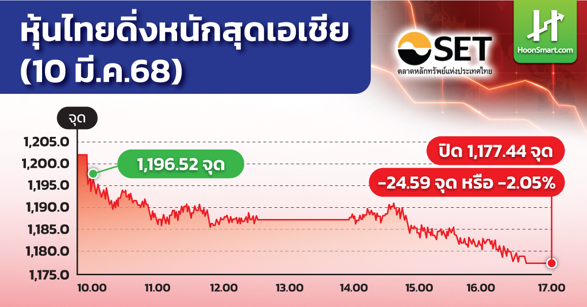 ตลาดหุ้นวันที่ 10 มี.ค. 2568 ตลาดหุ้นเอเชียมีทั้งบวกและลบคละกัน ส่วนหุ้นไทยดิ่งหนักสุดปิดที่ระดับต่ำสุดของวันที่ 1,177.44 จุด ทรุดลง-24.59 จุดหรือ-2.05%