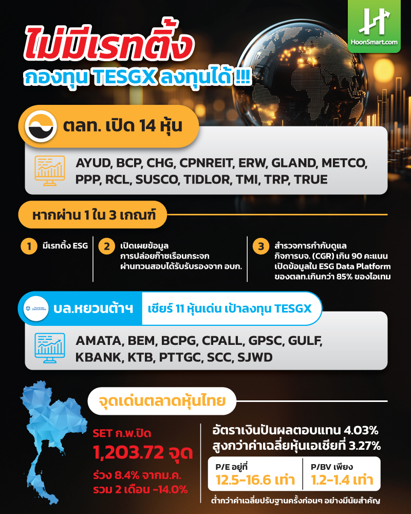 สำหรับหุ้นยั่งยืน (SET ESG Ratings) และหุ้นที่มีการเปิดเผยข้อมูลก๊าซเรือนกระจกสำหรับกองทุน Thai ESG และ Thai ESGX มีจำนวน 14 บริษัทที่ไม่มีเรทติ้ง ประกอบด้วย AYU, BCP, CHG, CONREIT, ERW, GLAND, METCO, PPP, RCL, SUSCO, TIDLOR, TMI, TRP และ TRUE