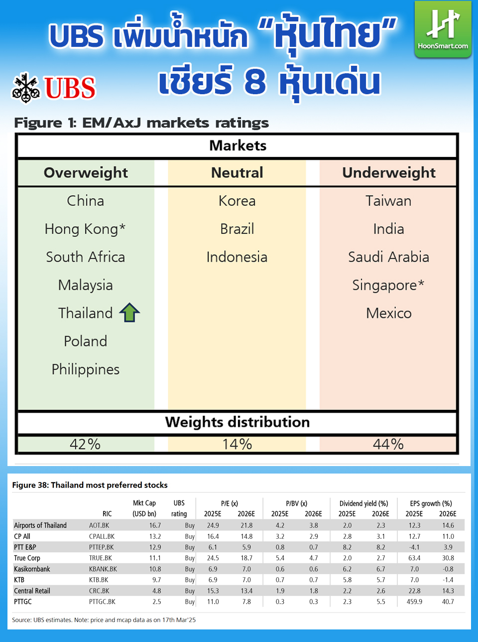 แม้จะมีมุมองเชิงบวกต่อมาเลเซียและฟิลิปปินส์ แต่เชื่อว่าตอนนี้ประเทศไทยมีโอกาสสำหรับ overweight จาก 1) ผลกระทบสูงสุดจากปัจจัยเชิงนโยบายที่ทำให้มีการเทขาย รวมทั้งสิทธิประโยชน์ทางภาษี LTF ที่สิ้นสุดลง และผลของเกณฑ์จำกัดน้ำหนักจำกัดน้ำหนักหลักทรัพย์รายตัวในดัชนีกำหนดไม่เกิน 10% อาจผ่านพ้นไปแล้ว 2) ทีมงาน UBS ประเทศไทยเชื่อว่าปัญหาเฉพาะตัวบริษัทส่วนหนึ่งในช่วงไม่นานมานี้ส่วนใหญ่ผ่านพ้นไปแล้วเช่นกัน
