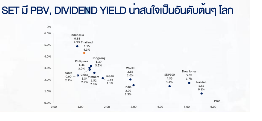 บล.เอเซียพลัส ระบุ ตลาดหุ้นไทยมี VALUATION ถูกมาก ในเชิงเปรียบเทียบ น่าทยอยสะสมหุ้นปันผลดี พื้นฐานแกร่ง โดยSET ย่อตัวลงมาลึกเกินไปที่ 1,200 จุด มี PBV68F 1.15 เท่า (-2SD) ต่ำสุดเป็นอันดับต้นๆ ของโลก และ SET มี DIVIDEND YIELD 68F สูง 4.3% (+1SD) สูงเป็นอันดับต้นๆ ของโลก