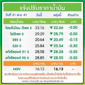 บริษัท ปตท.น้ำมันและการค้าปลีก (PTTOR) ในกลุ่มบริษัท ปตท. (PTT) และ บริษัทบางจาก คอร์ปอเรชั่น (BCP) ประกาศปรับลดราคาขายปลีกน้ำมันกลุ่มแก๊สโซฮอล์ทุกชนิดลง 30 สตางค์/ลิตร เว้น E85 ลดลง 15 สตางค์/ลิตร และกลุ่มดีเซล ลดลง 50 สตางค์/ลิตร มีผลวันพรุ่งนี้ตั้งแต่เวลา 05.00 น. ของวันที่ 22 พ.ย.2561