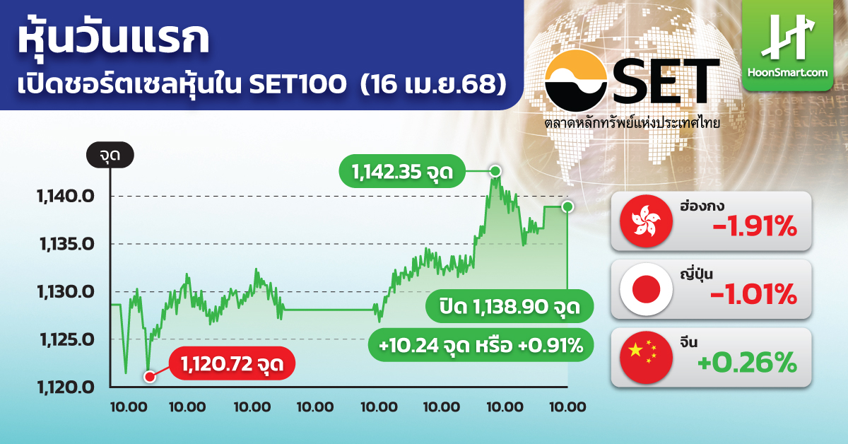ด้านตลาดหุ้นไทยเปิดทำการวันอังคารที่ 16 เม.ย.2568 หลังจากหยุดวันจันทร์ที่ผ่านมา และคณะกรรมการตลาดหลักทรัพย์มีมติเปิดให้หุ้นใน SET 100 นำมาชอร์ตเซลได้ ไม่ส่งผลกระทบต่อภาวะตลาด ดัชนีปิดที่ 1,138.90 จุด เพิ่มขึ้น 10.24 จุด หรือ +0.91% มูลค่าซื้อขาย 41,200.11 ล้านบาท และค่าเงินบาทแข็งค่าสุดในภูมิภาคปิดที่ 33.24 บาท/ดอลลาร์