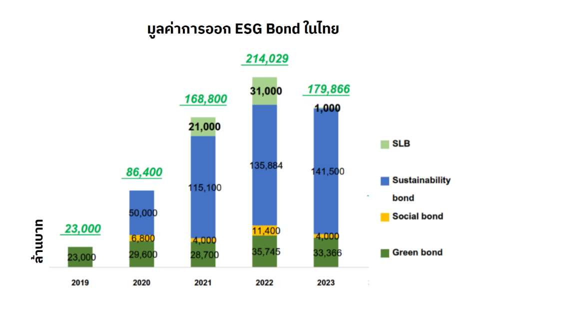 อย่างไรก็ตาม ตลาด ESG Bond ในประเทศไทย กำลังเติบโตอย่างเนื่อง จากมูลค่า 23,000 ล้านบาทในปี 2019 เพิ่มขึ้นเป็น 179,866 ล้านบาทในปี 2023 คิดเป็น 7.8 เท่า นอกจากนี้ ประเทศไทยยังมีการออก ESG Bond มากเป็นอันดับสองของประเทศในอาเซียน รองจากสิงคโปร์ (ที่มา: ThaiBMA ข้อมูล ณ 17/07/2023)