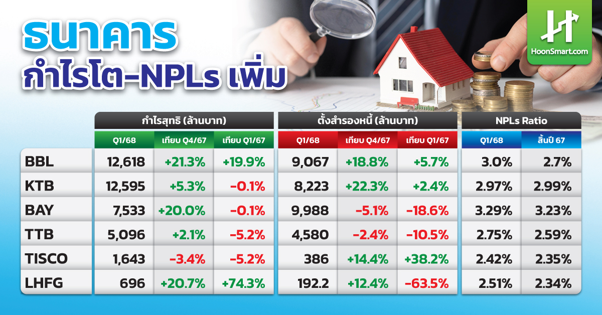 ธนาคาร 7 แห่ง ได้แก่ BBL,KTB,BAY,TTB,TISCO,LHFGและ CIMBT ประกาศกำไรสุทธิงวดไตรมาสที่ 1/2568 ออกมาแล้ว ส่วนใหญ่เป็นไปตามเป้าหมาย มีบางธนาคารที่ดีเกินคาด ตัวแปรหนึ่งคือผลขาดทุนด้านเครดิตที่คาดว่าจะเกิดขึ้น พิจารณาตั้งสำรองหนี้ลดลงหรือเพิ่มขึ้น โดยยังคงรักษาระดับ Coverage Ratio อยู่ในระดับสูง เพื่อรับมือความอ่อนไหวและความไม่แน่นอนของเศรษฐกิจ ขณะที่หนี้ด้อยคุณภาพ หรือ NPLs กลับเพิ่มขึ้น