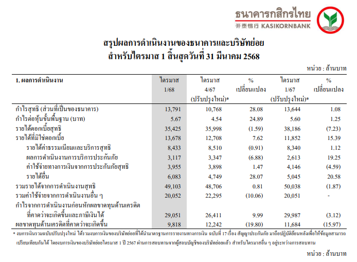 ส่วนผลการดำเนินงานไตรมาส 1 ปี 2568 เปรียบเทียบกับไตรมาส 4 ปี 2567 ที่ปรับปรุงใหม่ ธนาคารและบริษัทย่อยมีรายได้จากการดำเนินงานสุทธิเพิ่มขึ้นเล็กน้อยจำนวน 397 ล้านบาท หรือ 0.81% หลัก ๆ จากกำไรจากเครื่องมือทางการเงินที่วัดมูลค่าด้วยมูลค่ายุติธรรมผ่านกำไรหรือขาดทุน และรายได้จากการลงทุน แม้ว่ารายได้ดอกเบี้ยสุทธิจะลดลงตามภาวะตลาด