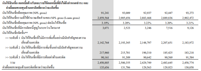 ทั้งนี้ เงินให้สินเชื่อด้อยคุณภาพต่อเงินให้สินเชื่อ (%NPL gross) อยู่ที่ระดับ 3.19% และค่าเผื่อผลขาดทุนด้านเครดิตที่คาดว่าจะเกิดขึ้นต่อเงินให้สินเชื่อด้อยคุณภาพ (Coverage ratio) เพิ่มขึ้นอยู่ที่ระดับ 159.49% สำหรับอัตราส่วนเงินกองทุนทั้งสิ้นต่อสินทรัพย์เสี่ยงของกลุ่มธุรกิจทางการเงินธนาคารกสิกรไทยตามหลักเกณฑ์ Basel III ณ วันที่ 31 มีนาคม 2568 ยังคงมีความแข็งแกร่งอยู่ที่ 20.52%
