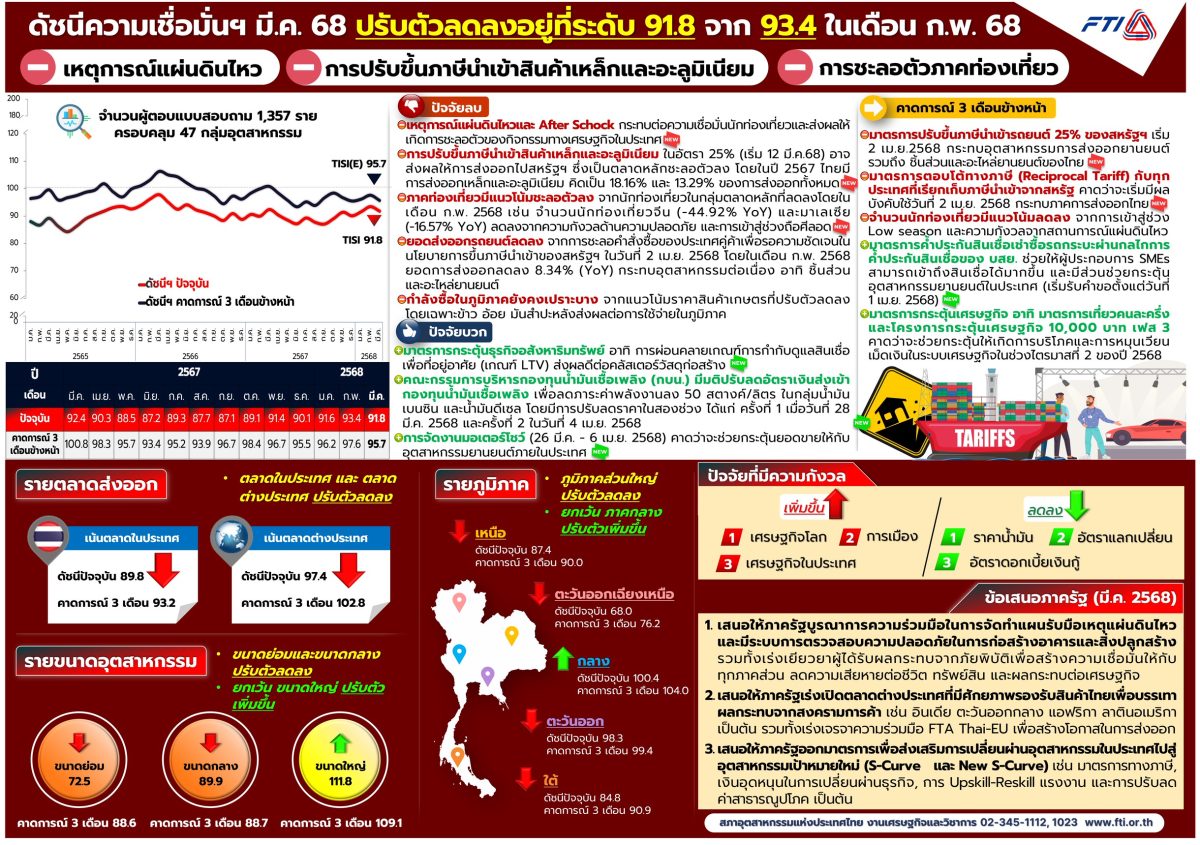 นายอภิชิต ประสพรัตน์ รองประธานสภาอุตสาหกรรมแห่งประเทศไทย (ส.อ.ท.) พร้อมด้วย ม.ล.ปีกทอง ทองใหญ่ รองประธานสภาอุตสาหกรรมแห่งประเทศไทย (ส.อ.ท.) และประธานสายงานเศรษฐกิจและวิชาการ ร่วมเปิดเผยผลการสำรวจดัชนีความเชื่อมั่นภาคอุตสาหกรรมในเดือนมีนาคม 2568 อยู่ที่ระดับ 91.8 ปรับตัวลดลง จาก 93.4 ในเดือนกุมภาพันธ์ 2568 ซึ่งเป็นผลจากเหตุการณ์แผ่นดินไหวและอาฟเตอร์ช็อก (Aftershock) กระทบต่อความเชื่อมั่นนักท่องเที่ยวและส่งผลให้เกิดการชะลอตัวของกิจกรรมทางเศรษฐกิจในประเทศ มีการปรับขึ้นภาษีนำเข้าสินค้าเหล็กและอะลูมิเนียม ในอัตรา 25% (เริ่ม 12 มีนาคม 2568) อาจส่งผลให้การส่งออกไปสหรัฐฯ ซึ่งเป็นตลาดหลักชะลอตัวลง โดยในปี 2567 ไทยมีการส่งออกเหล็กและอะลูมิเนียม คิดเป็น 18.16% และ 13.29% ของการส่งออกทั้งหมด