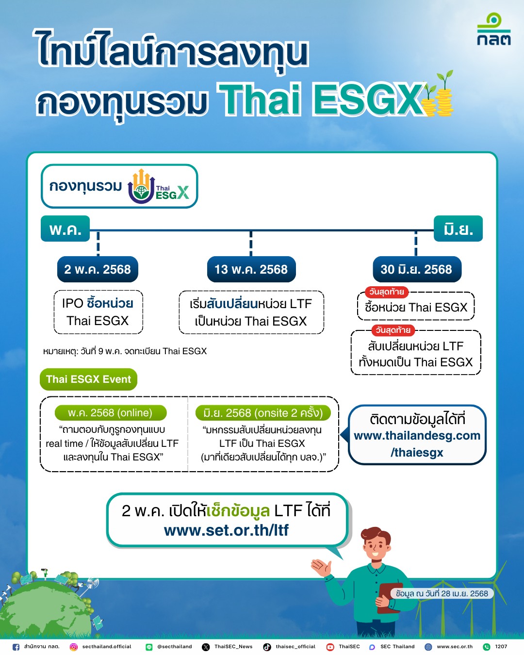 กระทรวงการคลัง สำนักงานคณะกรรมการกำกับหลักทรัพย์และตลาดหลักทรัพย์ (ก.ล.ต.) สมาคมบริษัทจัดการลงทุน (AIMC) และตลาดหลักทรัพย์แห่งประเทศไทย ร่วมแถลงข่าวความพร้อมเพื่อสนับสนุนการลงทุนในกองทุน Thai ESGX และรองรับการสับเปลี่ยนหน่วยลงทุนจากกองทุนรวมหุ้นระยะยาว (LTF) ไป Thai ESGX ในช่วงเวลา 2 เดือน คือ พฤษภาคม – มิถุนายน 2568 ตามเงื่อนไขที่กรมสรรพากรกำหนด ก.ล.ต.ได้ออกหลักเกณฑ์รองรับจัดตั้งและจัดการ Thai ESGX ในขณะนี้มี Thai ESGX รวม 37 กองทุน จากบริษัทหลักทรัพย์จัดการกองทุน (บลจ.) 19 แห่ง อยู่ระหว่างพิจารณาคำขออนุมัติจัดตั้ง