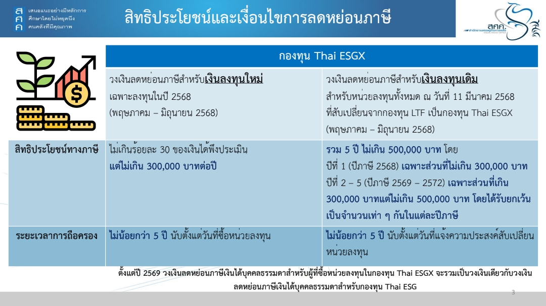 1) การลดหย่อนภาษีสำหรับการซื้อหน่วยลงทุนในกองทุน Thai ESGX และ 2) การลดหย่อนภาษีสำหรับการสับเปลี่ยนหน่วยลงทุนจากกองทุน LTF เป็นกองทุน Thai ESGX ซึ่งมาตรการดังกล่าวนี้ จะช่วยเพิ่มทางเลือกในการลงทุน เพิ่มจำนวนนักลงทุนที่ตระหนักถึงความยั่งยืน รวมถึงเพิ่มสัดส่วนของนักลงทุนสถาบันที่เน้นการลงทุนในธุรกิจที่มีเป้าหมายด้านความยั่งยืน ตลอดจนผลักดันให้บริษัทจดทะเบียนในตลาดหลักทรัพย์ปรับธุรกิจสู่ความยั่งยืนในระยะยาว