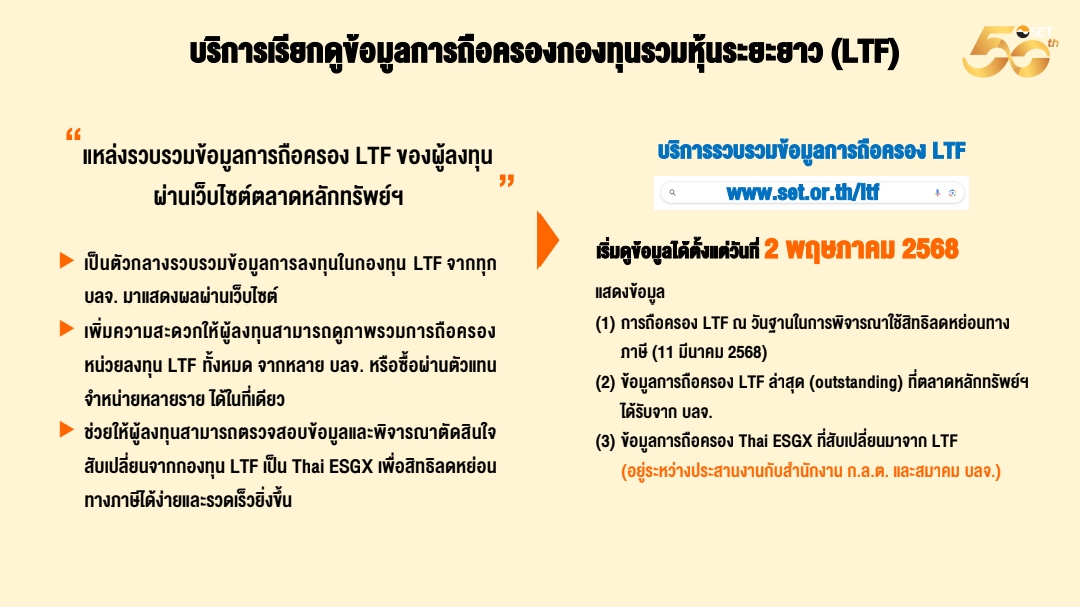นายอัสสเดช คงสิริ กรรมการและผู้จัดการ ตลาดหลักทรัพย์แห่งประเทศไทย กล่าวว่า ตลาดหลักทรัพย์ฯ มีความพร้อมในการให้บริการข้อมูล LTF แก่ผู้ลงทุนผ่านเว็บไซต์ตลาดหลักทรัพย์ฯ โดยจะสามารถดูภาพรวมการถือครองหน่วยลงทุน LTF ทั้งหมดของตนเองจากทุก บลจ. ได้ในที่เดียวฟรีไม่มีค่า่ใช้จ่าย ทำให้สามารถตรวจสอบข้อมูลและพิจารณาตัดสินใจสับเปลี่ยนจากกองทุน LTF เป็น Thai ESGX เพื่อสิทธิลดหย่อนทางภาษีได้ง่ายและรวดเร็วยิ่งขึ้น