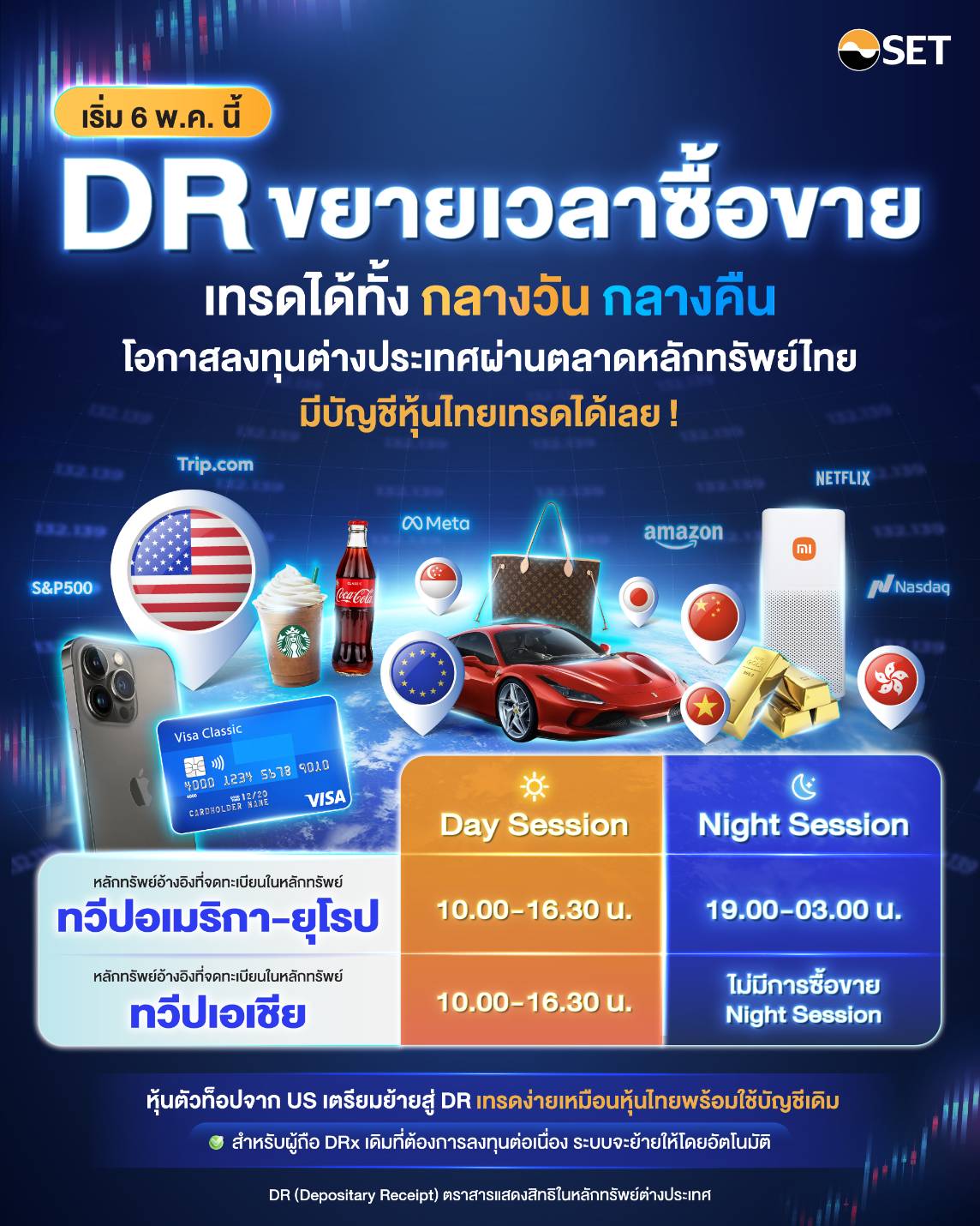ดร.รินใจ ชาครพิพัฒน์ รองผู้จัดการ หัวหน้าสายงานการตลาด ตลาดหลักทรัพย์แห่งประเทศไทย เปิดเผยว่า ตั้งแต่วันที่ 6 พฤษภาคม 2568 เป็นต้นไป จะขยายเวลาการซื้อขายสำหรับตราสารแสดงสิทธิในหลักทรัพย์ต่างประเทศ (Depositary Receipt หรือ DR) ที่อ้างอิงหลักทรัพย์จดทะเบียนในตลาดหลักทรัพย์ในทวีปอเมริกาและยุโรป ให้สามารถซื้อขายได้ทั้งกลางวันและกลางคืน ตั้งแต่เวลา 10.00-16.30 น. และ 19.00-03.00 น. (ของวันถัดไป) ขณะที่ DR เอเชีย ยังคงซื้อขายในเวลากลางวันเช่นเดิมซึ่งสอดคล้องตามเวลาประเทศไทย