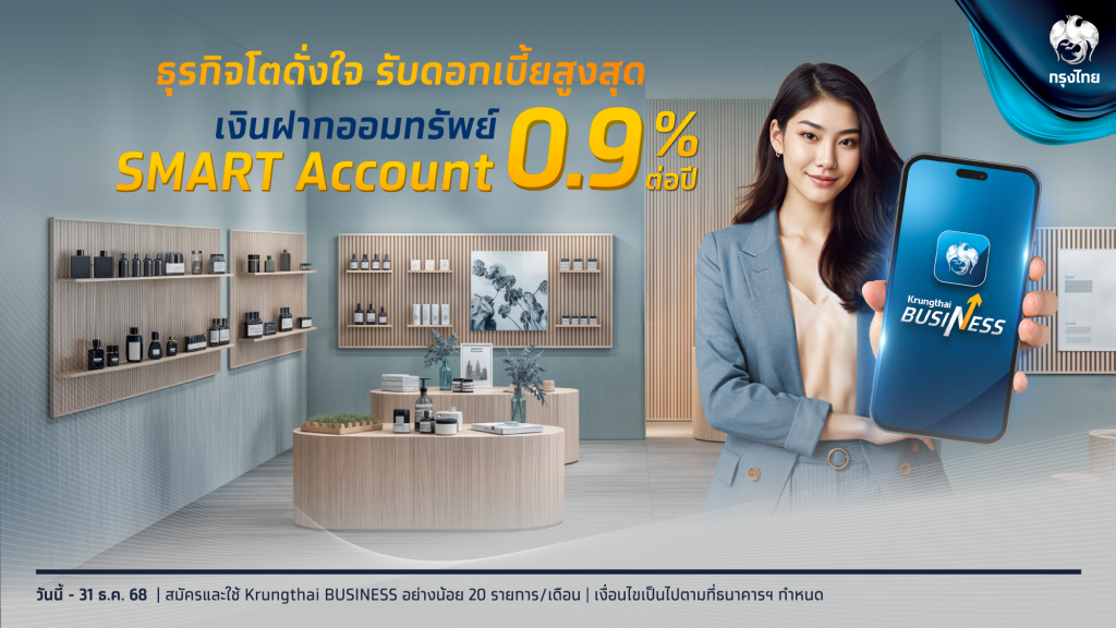 ธนาคารกรุงไทย (KTB) ในฐานะธนาคารพาณิชย์ชั้นนำของประเทศ มุ่งมั่นพัฒนาผลิตภัณฑ์และบริการทางการเงินที่ทันสมัย เพื่อตอบโจทย์ลูกค้าทุกมิติ สนับสนุนธุรกิจ SME เพิ่มประสิทธิภาพการบริหารธุรกิจด้วย Krungthai BUSINESS ดิจิทัลแพลตฟอร์มที่เป็นผู้ช่วยจัดการธุรกิจอย่างครบวงจร ล่าสุด ธนาคารออก เงินฝากออมทรัพย์พิเศษ SMART Account อัตราดอกเบี้ยสูงสุด 0.9% ต่อปี โดยจ่ายดอกเบี้ยทุก 6 เดือน มิถุนายนและธันวาคม สำหรับลูกค้านิติบุคคลที่สมัครใช้บริการและทำธุรกรรมผ่าน Krungthai BUSINESS อย่างน้อย 20 รายการต่อเดือน และมียอดเงินฝากออมทรัพย์พิเศษคงเหลือในบัญชีในแต่ละวัน ตามเงื่อนไขที่ธนาคารกำหนด ตั้งแต่วันนี้จนถึง 31 ธันวาคม 2568