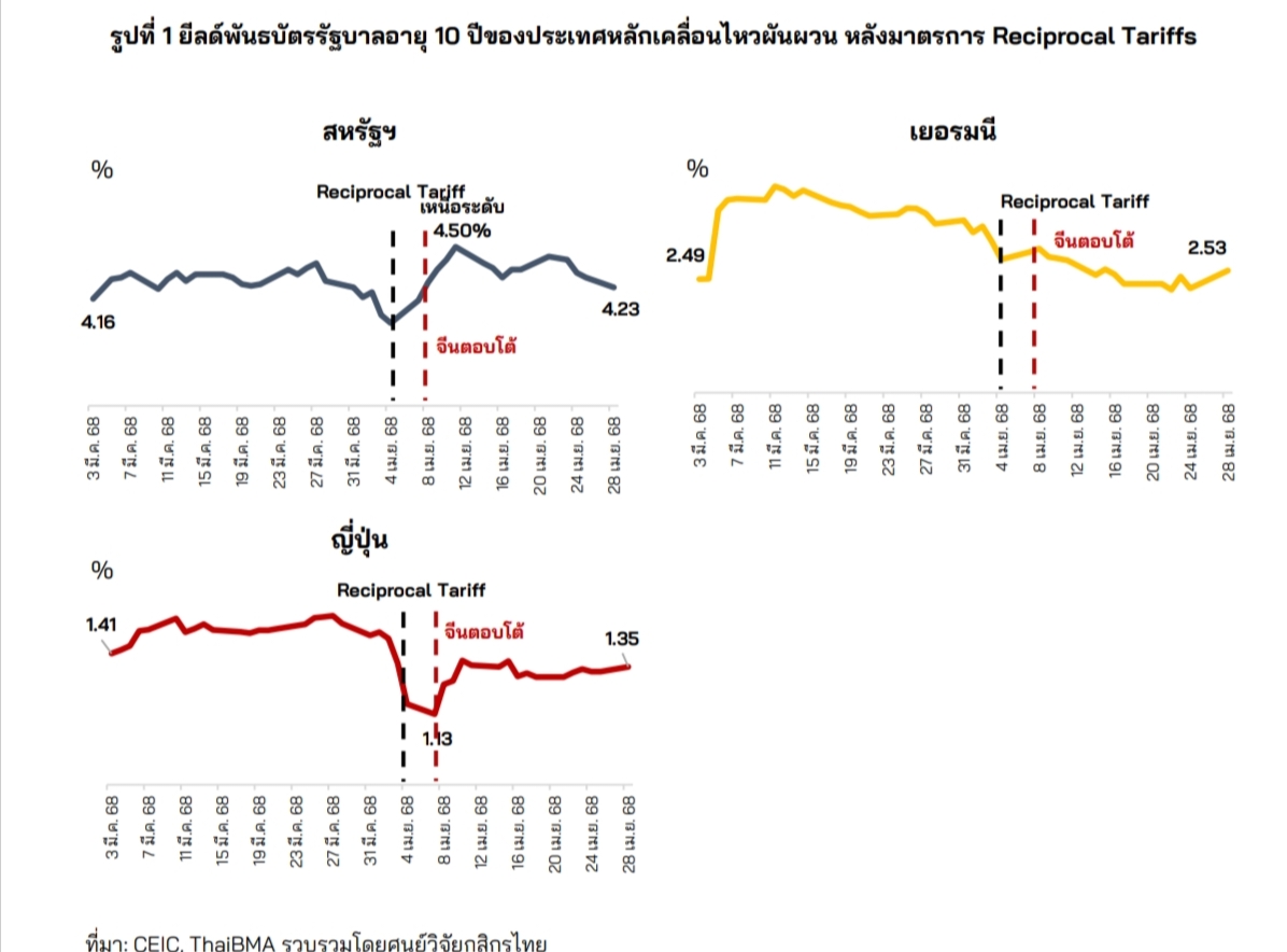 ศูนย์วิจัยกสิกรไทย ระบุว่า ตลาดพันธบัตรรัฐบาลประเทศหลักทั่วโลกเผชิญความผันผวนหลังการประกาศ Reciprocal Tariffs ของสหรัฐฯ และมาตรการตอบโต้จากจีน โดยยีลด์พันธบัตรรัฐบาลสหรัฐฯ ปรับตัวขึ้นเหนือระดับ 4.50% ซึ่งสูงสุดนับตั้งแต่เดือนกุมภาพันธ์ 2568