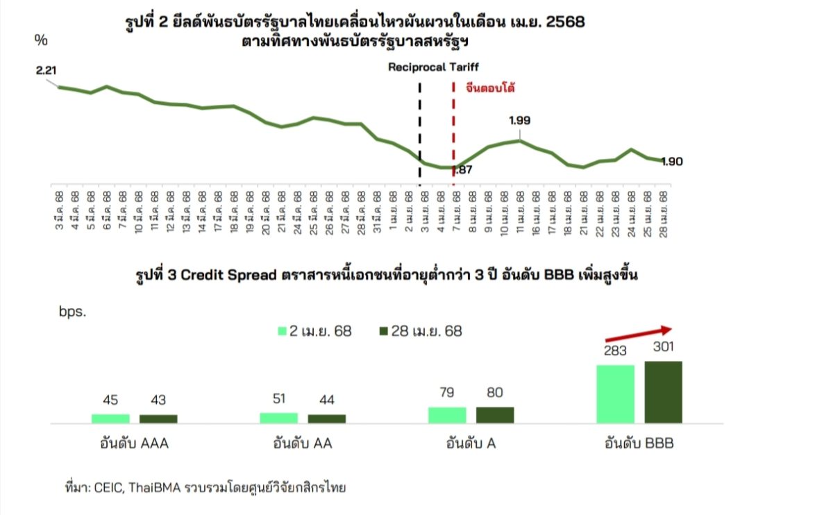 2.FED อาจปรับลดดอกเบี้ยได้ถึง 3 ครั้งภายในปีนี้เนื่องจากสหรัฐฯ มีความเสี่ยงที่จะเผชิญกับภาวะเศรษฐกิจถดถอยจากการปรับขึ้นภาษีนำเข้า ซึ่งจะมีผลทำให้ยีลด์พันธบัตรรัฐบาลสหรัฐฯ อาจปรับลดลงเพิ่มเติม ซึ่งจะเพิ่มแรงกดดันต่อการเคลื่อนไหวของยีลด์พันธบัตรรัฐบาลไทยในช่วงที่เหลือของปี