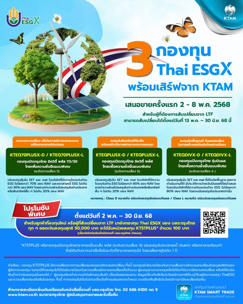 นอกจากนี้ บริษัทฯ ยังได้จัดโปรโมชันสำหรับกลุ่มกองทุน Thai ESGX ตั้งแต่วันที่ 2 พ.ค. – 30 มิ.ย. 2568 นี้ โดยผู้ลงทุนที่ลงทุนใหม่ หรือผู้ลงทุนที่สับเปลี่ยนจากLTF ไปยังกองทุน Thai ESGX ทุก ๆ ยอดเงินลงทุนสุทธิ 50,000 บาท และคงยอดเงินลงทุนสุทธิไว้ถึงวันที่ 30 เม.ย.2569 จะได้รับหน่วยลงทุนของกองทุนเปิดกรุงไทยตราสารหนี้ระยะสั้น พลัส (KTSTPLUS) (ความเสี่ยงระดับ 4) เน้นลงทุนในตราสารหนี้ เงินฝาก หรือตราสารเทียบเท่า ซึ่งมีอันดับความน่าเชื่อถือในระดับที่สามารถลงทุนได้ โดยเฉลี่ยอายุไม่เกิน 1 ปี จำนวน 100 บาท (เงื่อนไขเป็นไปตามที่บริษัทฯ กำหนด) ศึกษาข้อมูลโปรโมชันเพิ่มเติมได้ที่ โปรโมชันสำหรับชนิดเงินลงทุนใหม่ https://bit.ly/4jxdAHH ชนิดสับเปลี่ยน LTF https://bit.ly/4jSXKH0