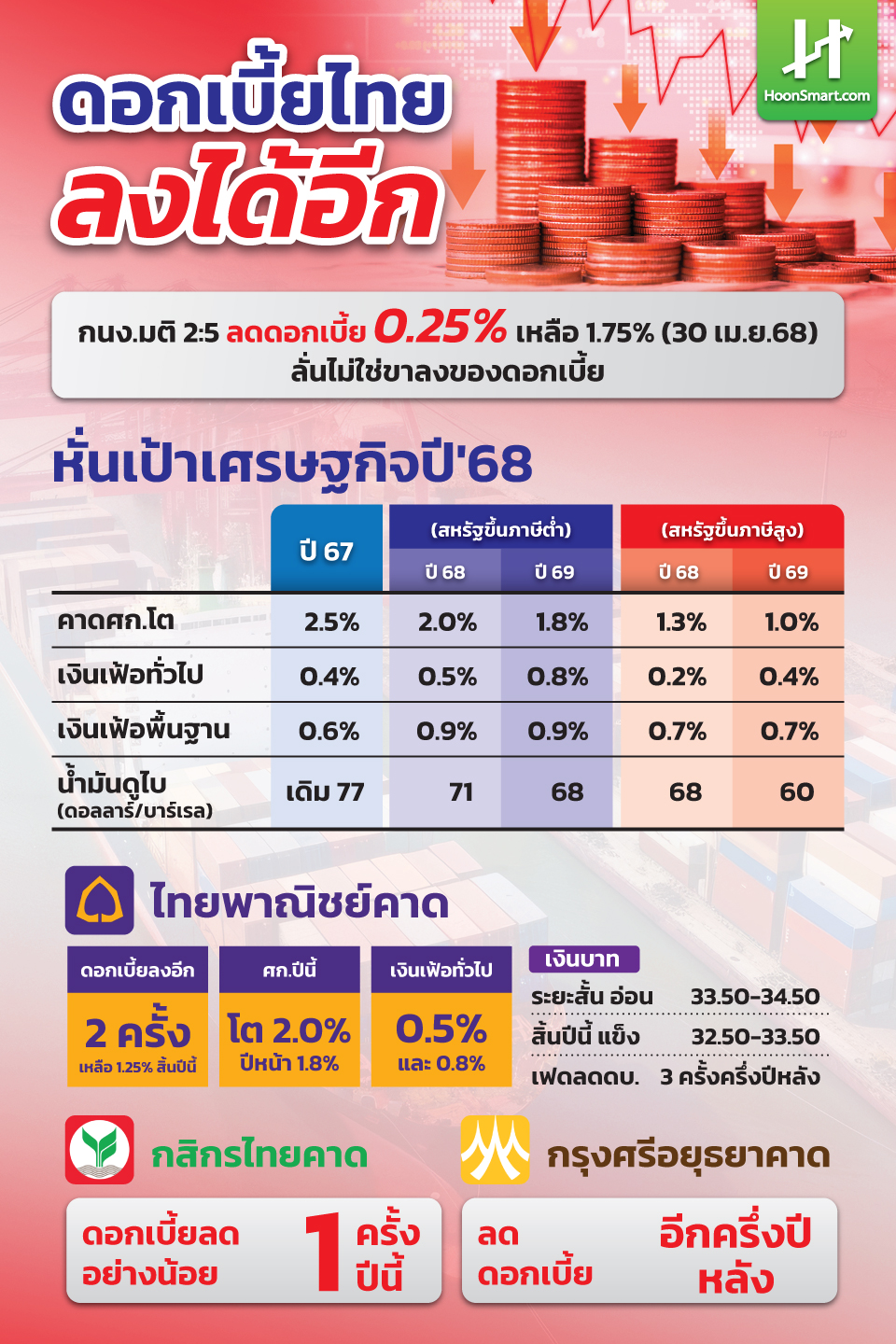 HoonSmart.com>>กนง.มติไม่เป็นเอกฉันท์ 5 ต่อ 2 เสียงลดดอกเบี้ย 0.25% เหลือ 1.75% ลั่นไม่ใช่วัฎจักรขาลง หั่นคาดเศรษฐกิจปีนี้โต 2%เลวร้ายสุดอาจโตแค่ 1.3% ภาวะการเงินยังตึงตัว แนะเอกชนโดยเฉพาะผู้ส่งออกรายใหญ่ไปสหรัฐต้องปรับตัว SCB EIC คาดดอกเบี้ยลงอีก 2 ครั้ง เริ่มมิ.ย. สิ้นปีนี้พบกัน 1.25% ด้านหุ้นเด้งขึ้น 2.23% ดัชนีจ่อ 1,200 จุด ต่างชาติ-สถาบันไทยไล่ซื้อรวม 4,564 ล้านบาท ด้านเศรษฐกิจสหรัฐช็อคโลก ไตรมาสแรกหดตัว 0.3%