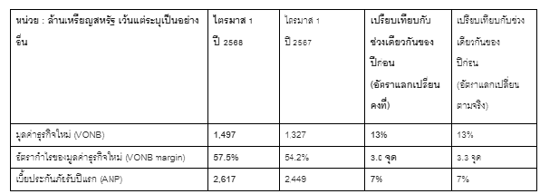 สำหรับ เอไอเอ ประเทศไทย มีอัตราการเติบโตของมูลค่าธุรกิจใหม่ที่โดดเด่นมาก โดยได้รับประโยชน์จากการขายแบบครั้งเดียวผ่านช่องทางตัวแทนก่อนที่จะมีการเปลี่ยนแปลงกฎระเบียบที่เกี่ยวข้องกับผลิตภัณฑ์ประกันสุขภาพรายบุคคลตั้งแต่เดือนมีนาคม 2568 นอกจากนี้ ยังเห็นถึงการเติบโตที่แข็งแกร่งมากของมูลค่าธุรกิจใหม่ จากการขายผลิตภัณฑ์ประกันผ่านช่องทางธนาคาร ซึ่งขับเคลื่อนด้วยความร่วมมือเชิงกลยุทธ์กับธนาคารกรุงเทพ
